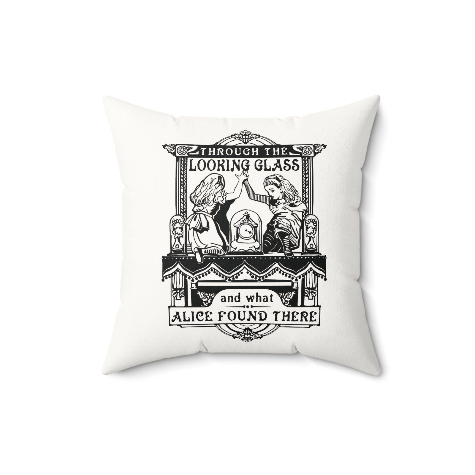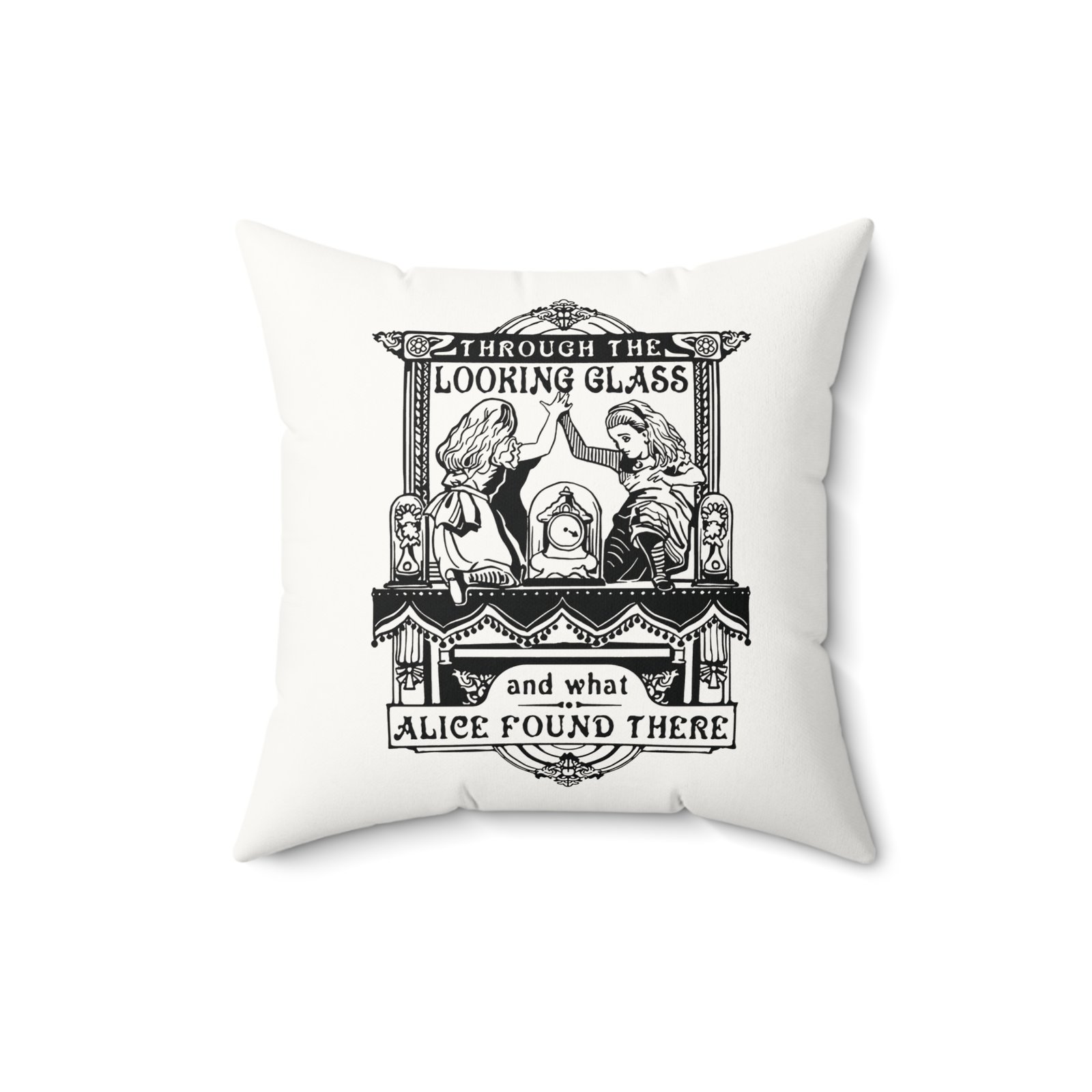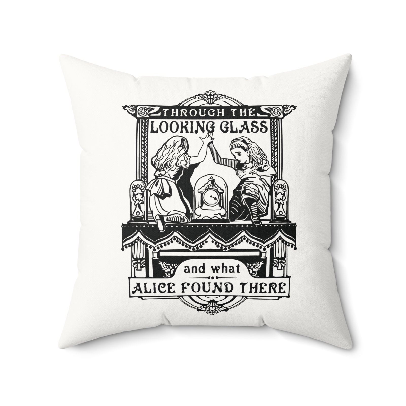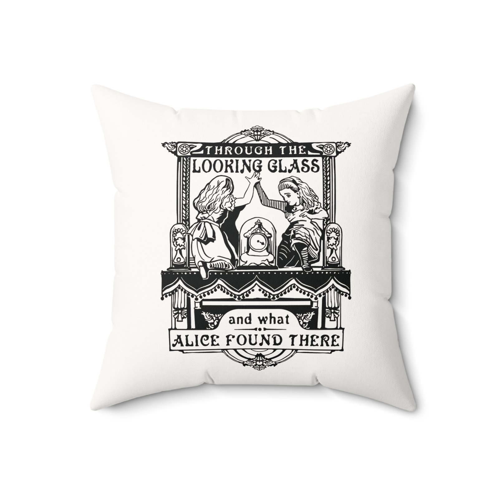 Alice Through the Looking Glass pillow, Alice in Wonderland throw pillow, faux suede pillow, vintage Alice illustration, black and white literary art, classic literature décor, book lover gift, Wonderland décor, Lewis Carroll art, storybook illustration pillow, whimsical home décor, cottagecore décor, aesthetic throw pillow