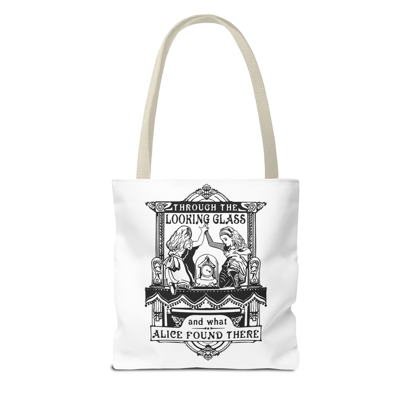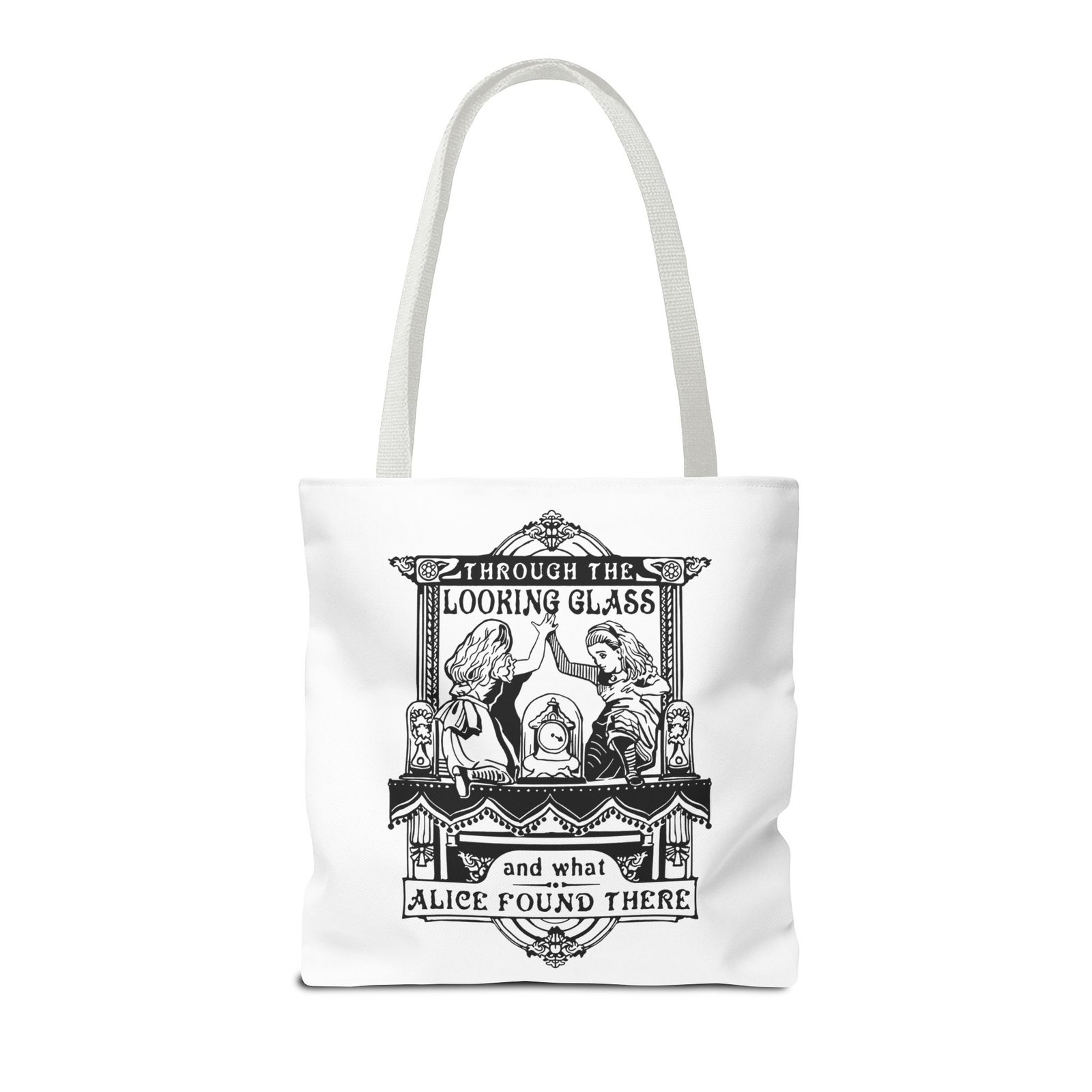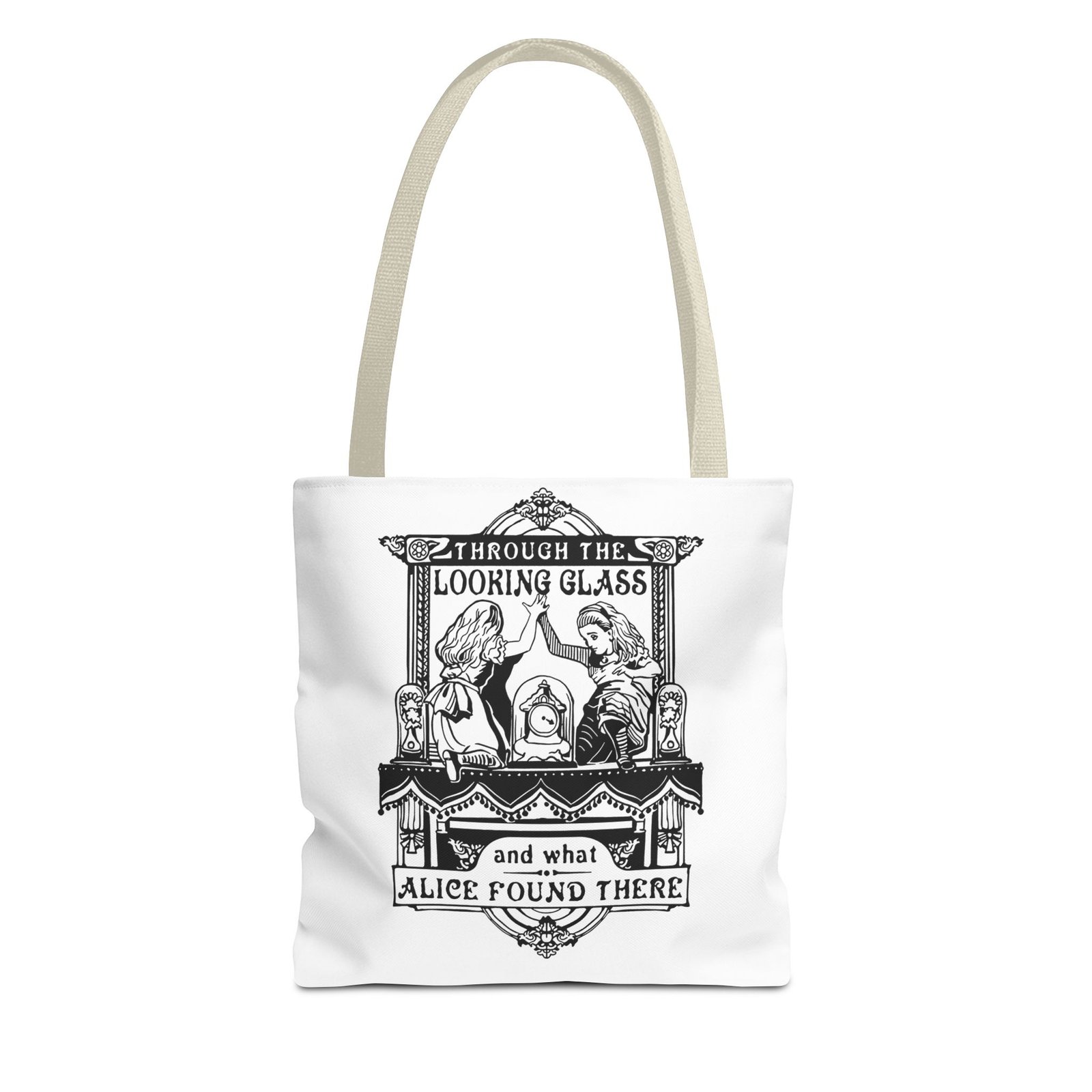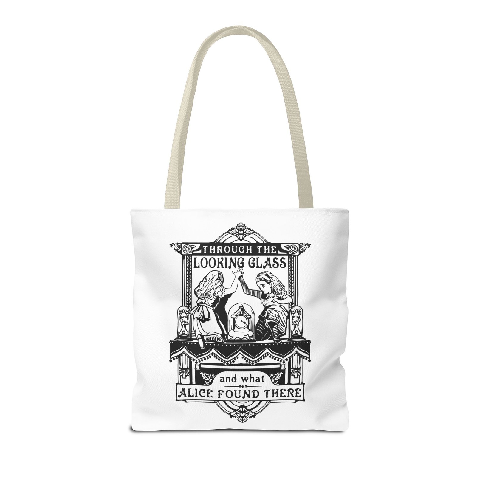 Carry a touch of classic Wonderland wherever you go with this Alice Through the Looking-Glass tote bag. Featuring a vintage black-and-white illustration inspired by Through the Looking-Glass by Lewis Carroll, this design captures the timeless charm, curiosity, and dreamlike atmosphere of Alice’s journey beyond the mirror.
