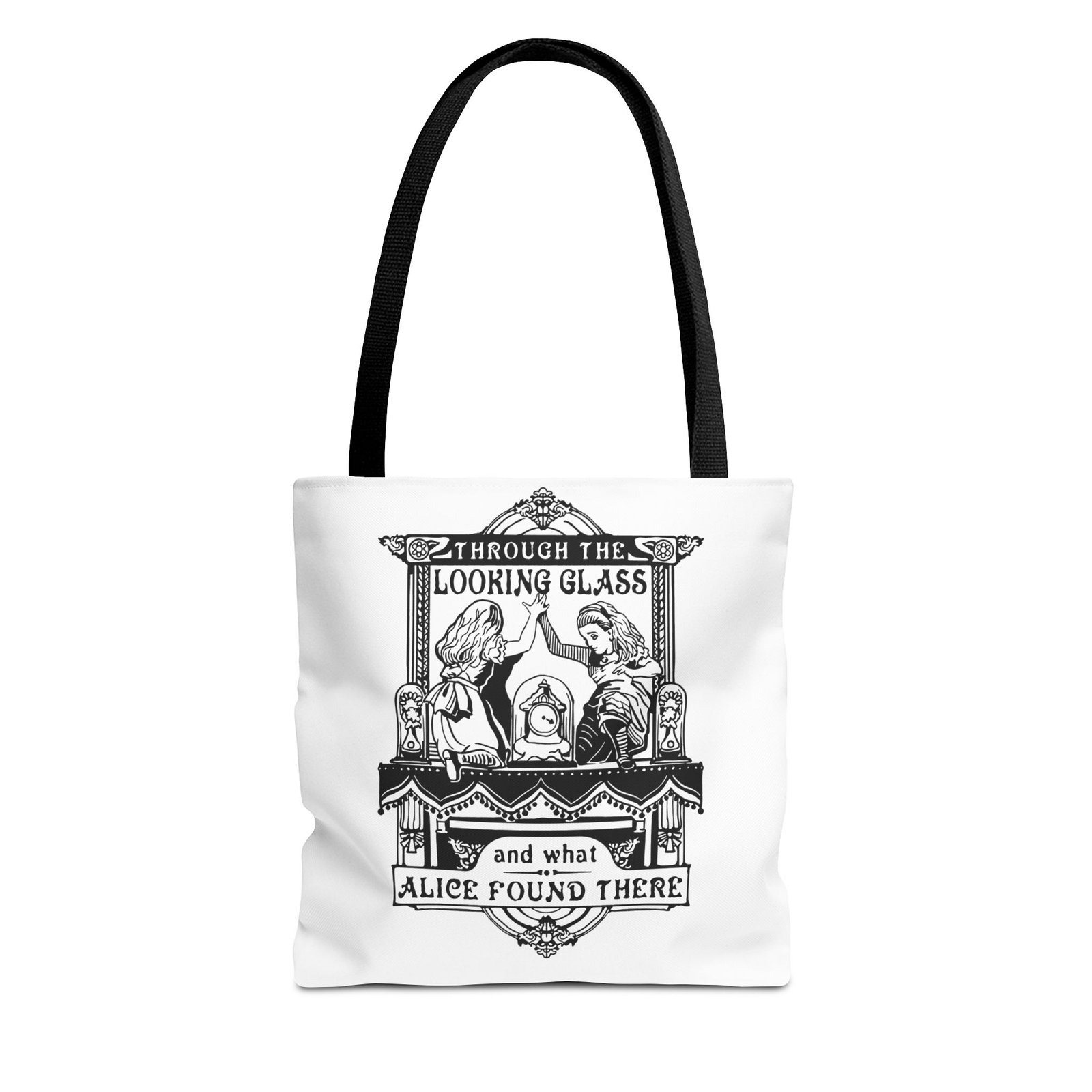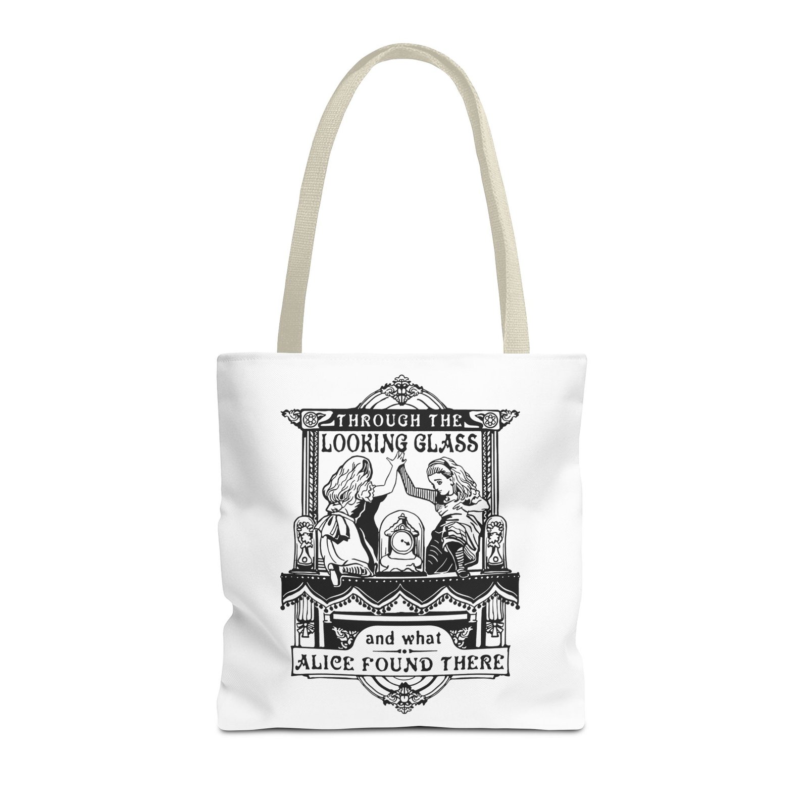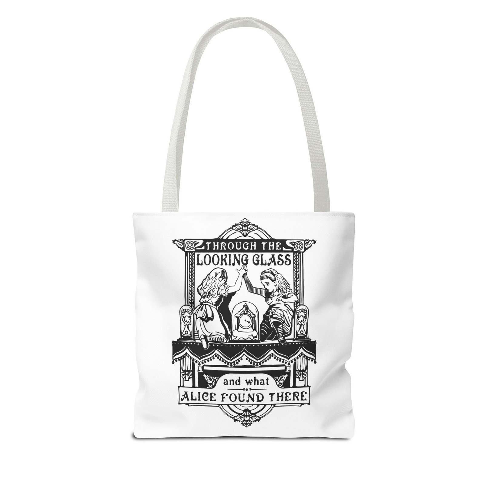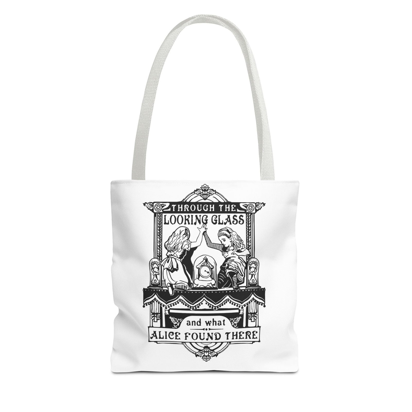 Carry a touch of classic Wonderland wherever you go with this Alice Through the Looking-Glass tote bag. Featuring a vintage black-and-white illustration inspired by Through the Looking-Glass by Lewis Carroll, this design captures the timeless charm, curiosity, and dreamlike atmosphere of Alice’s journey beyond the mirror.