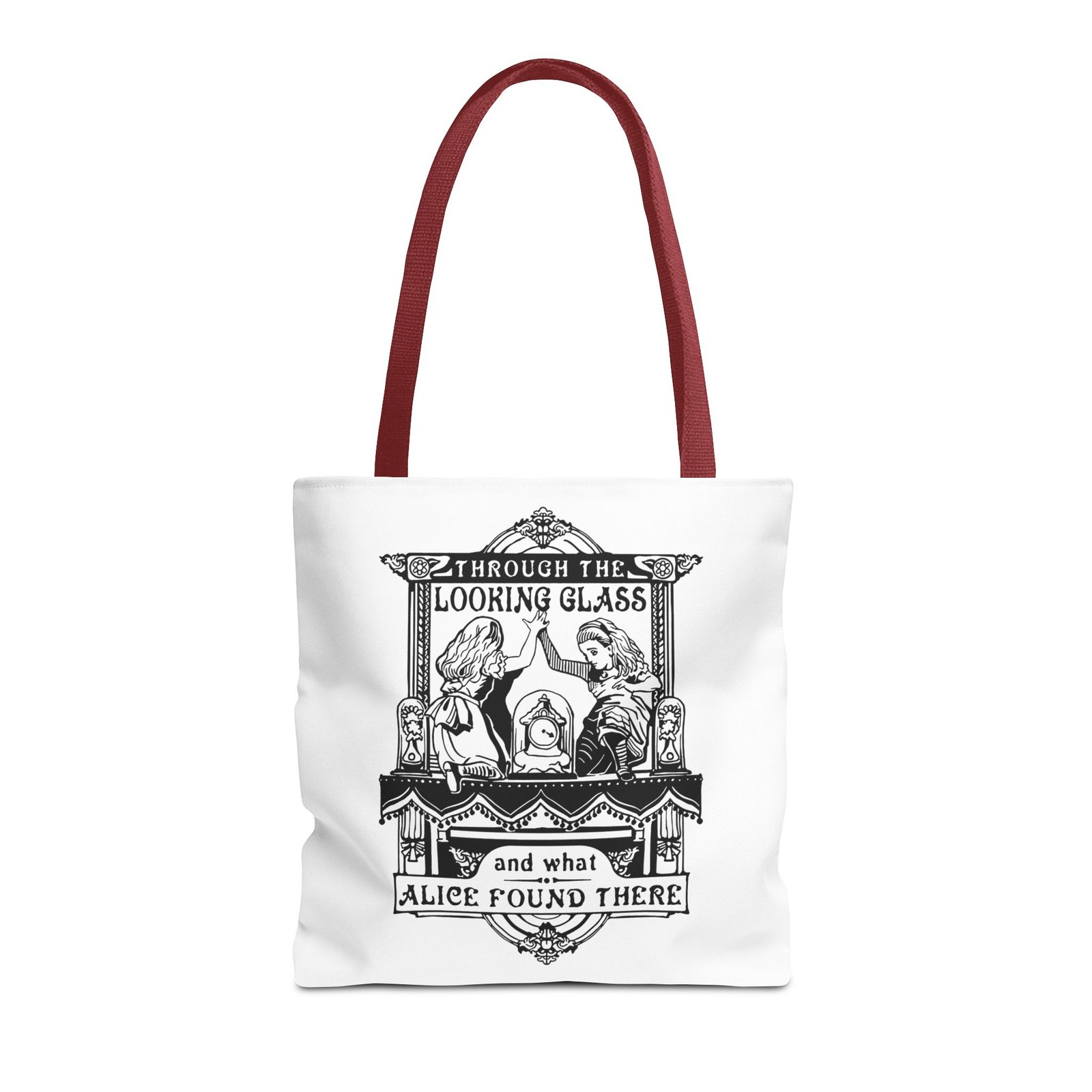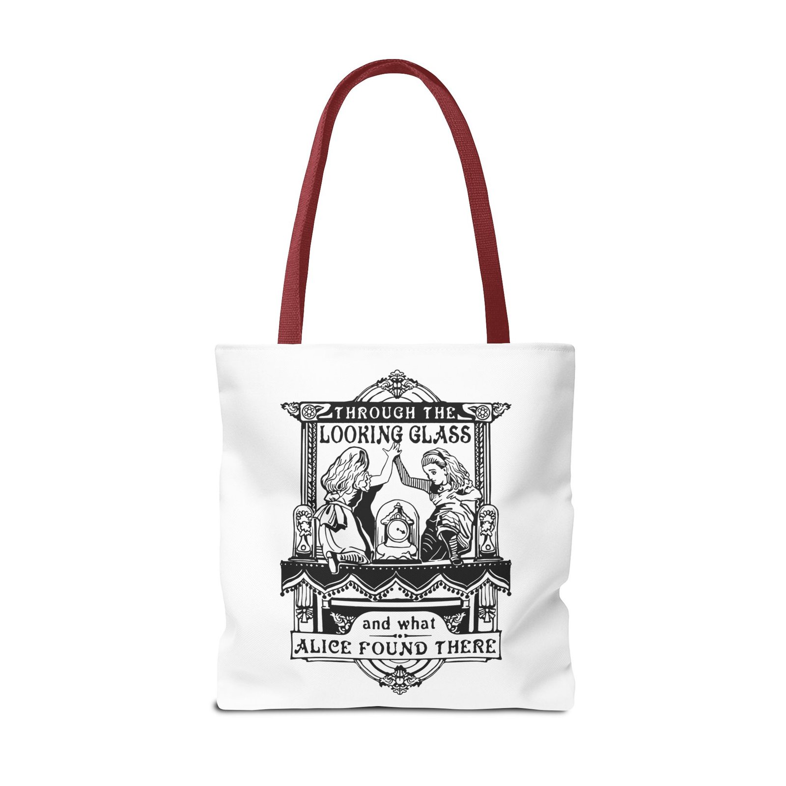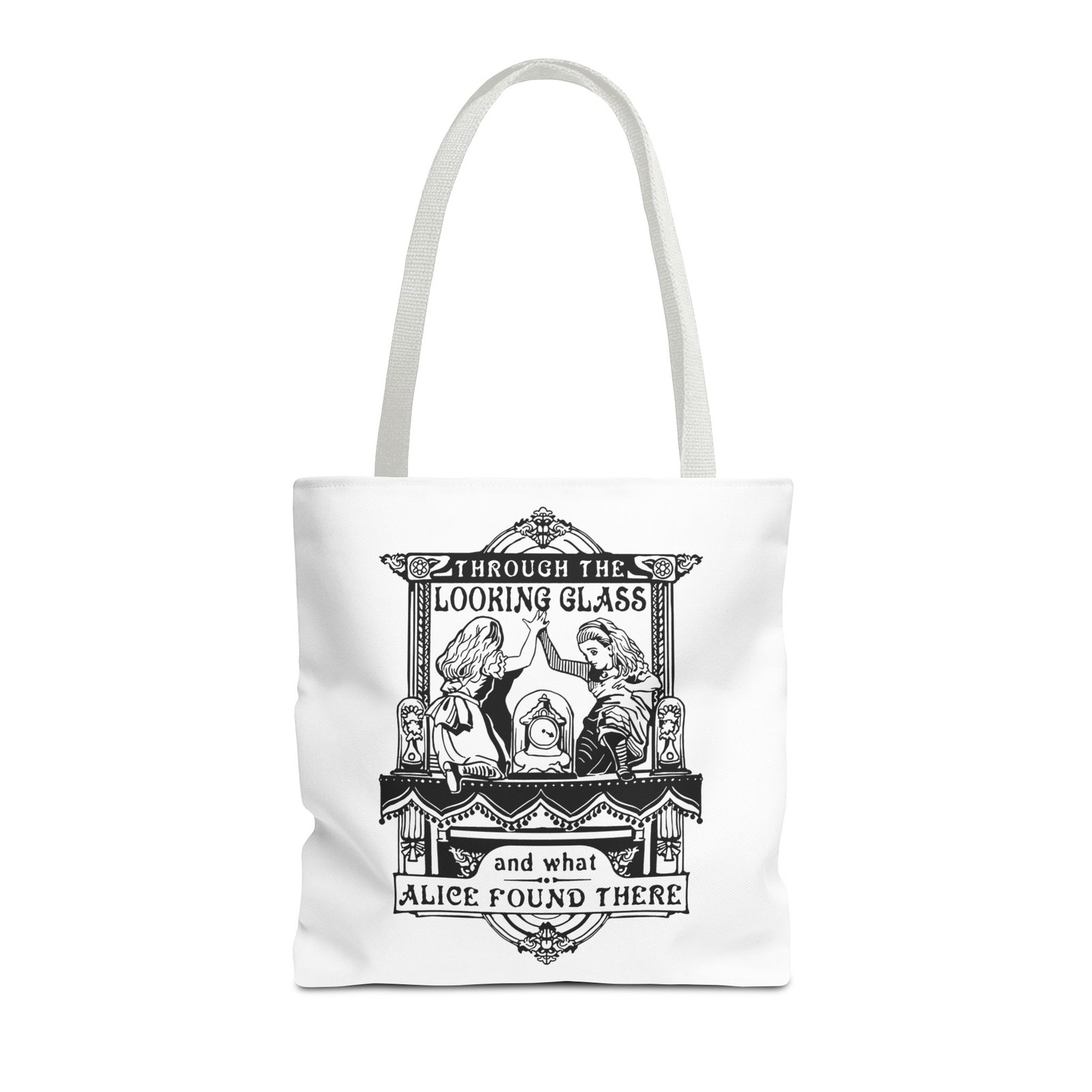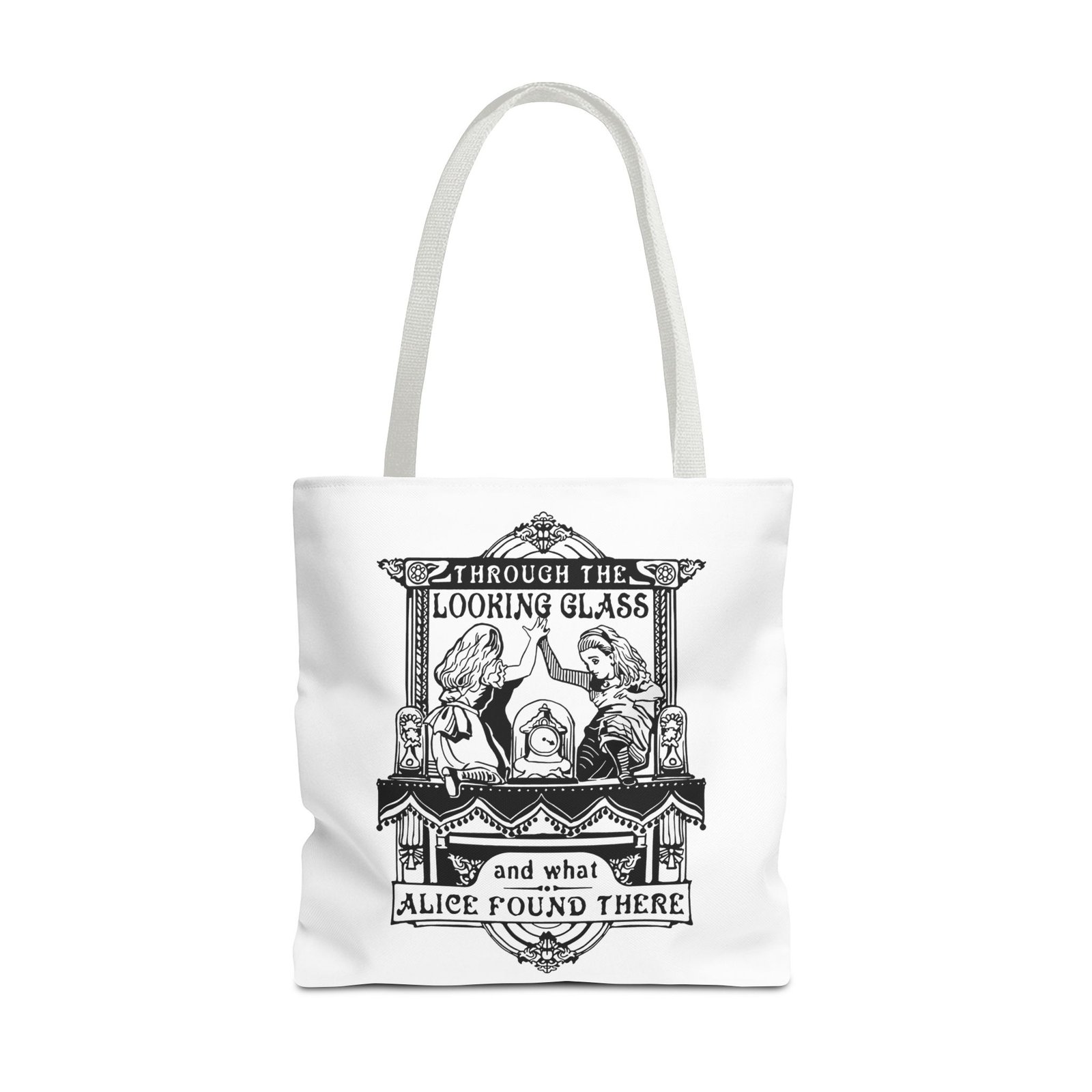 Carry a touch of classic Wonderland wherever you go with this Alice Through the Looking-Glass tote bag. Featuring a vintage black-and-white illustration inspired by Through the Looking-Glass by Lewis Carroll, this design captures the timeless charm, curiosity, and dreamlike atmosphere of Alice’s journey beyond the mirror.