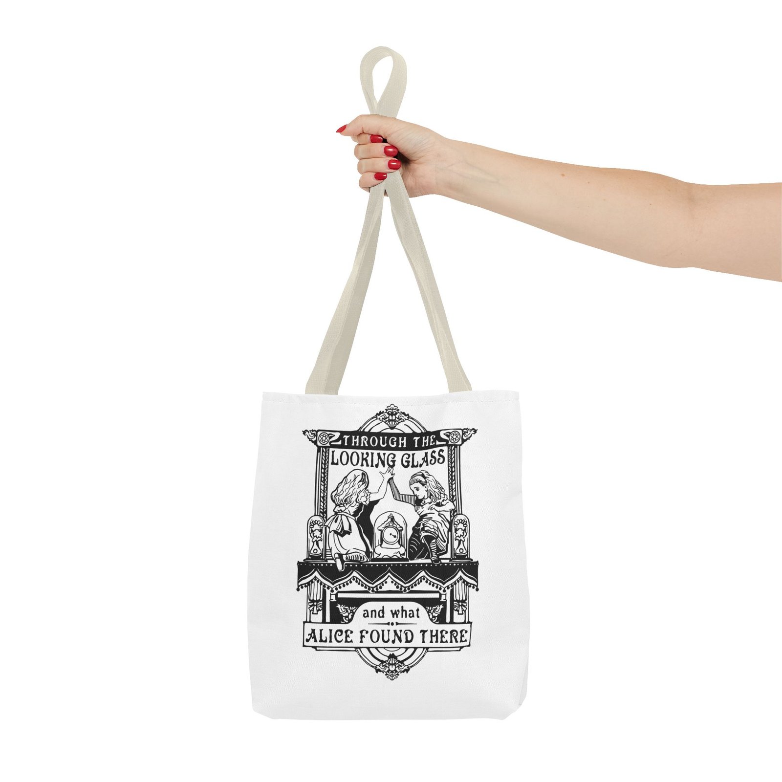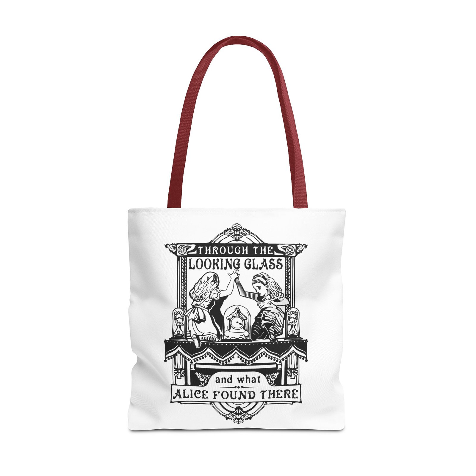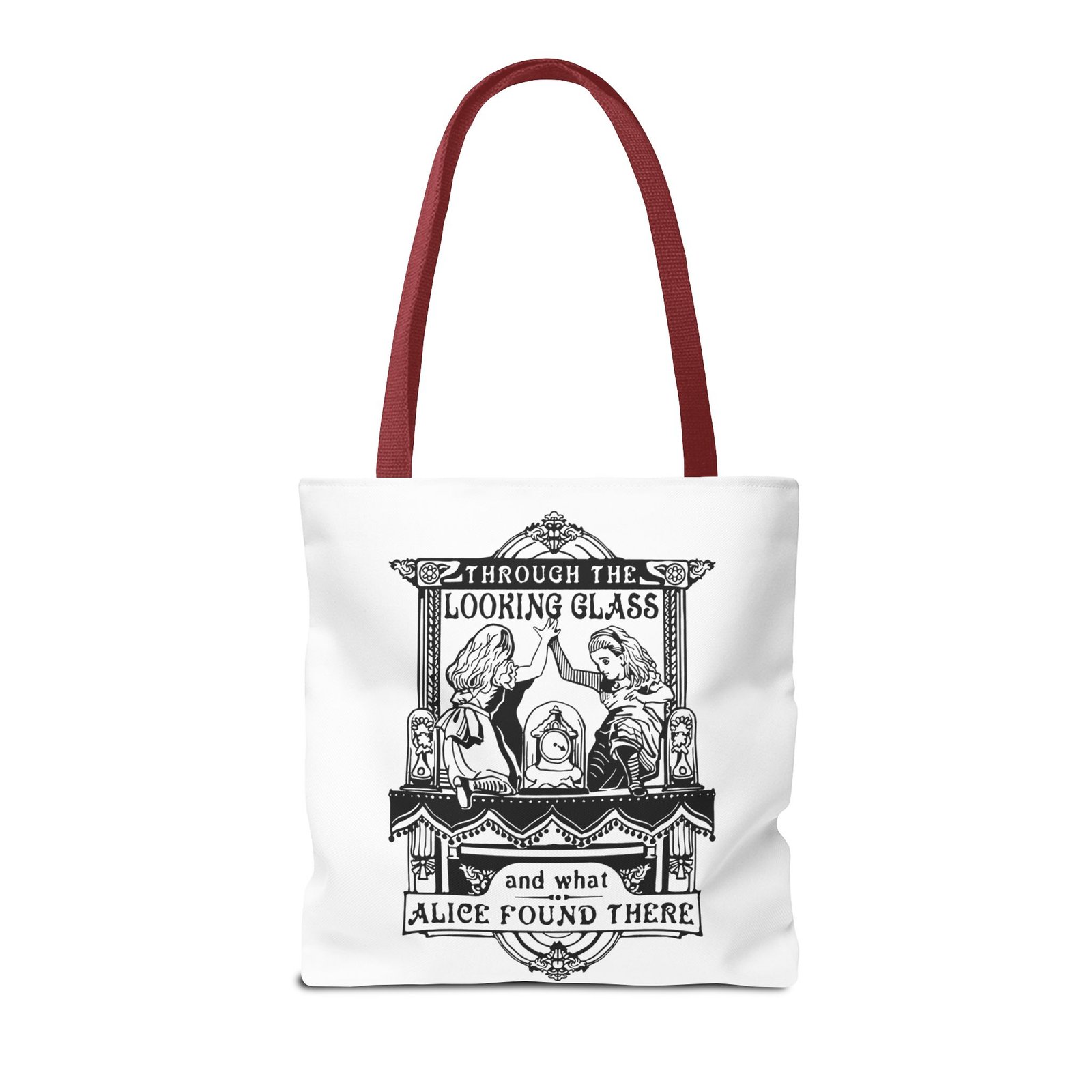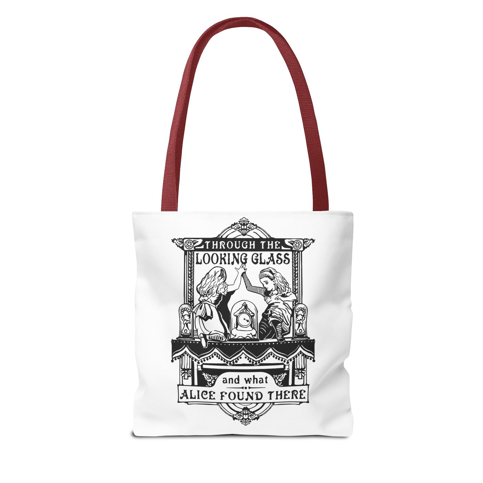 Carry a touch of classic Wonderland wherever you go with this Alice Through the Looking-Glass tote bag. Featuring a vintage black-and-white illustration inspired by Through the Looking-Glass by Lewis Carroll, this design captures the timeless charm, curiosity, and dreamlike atmosphere of Alice’s journey beyond the mirror.