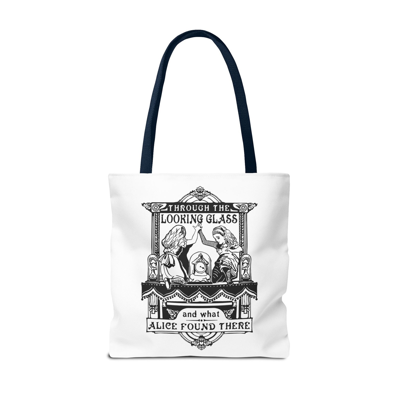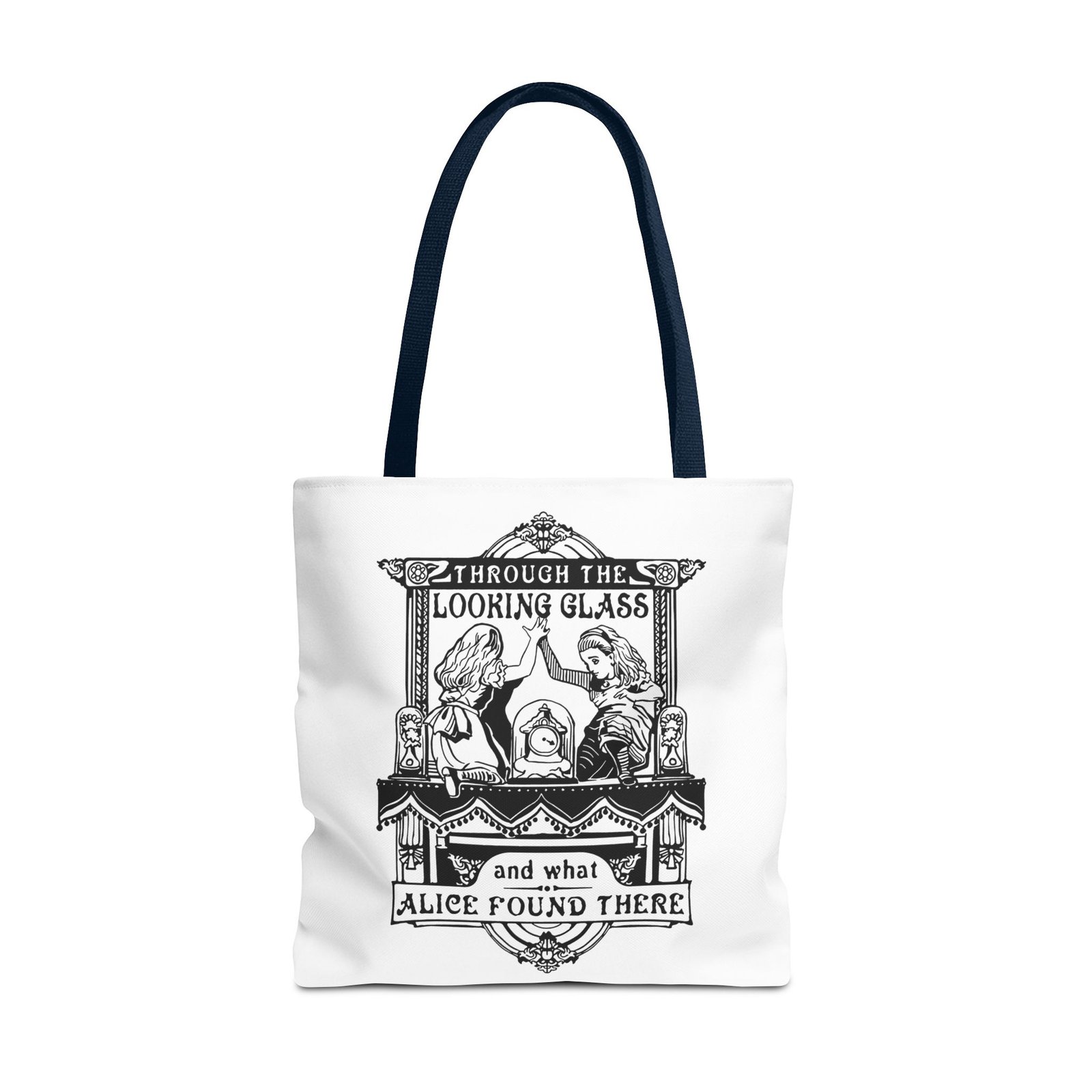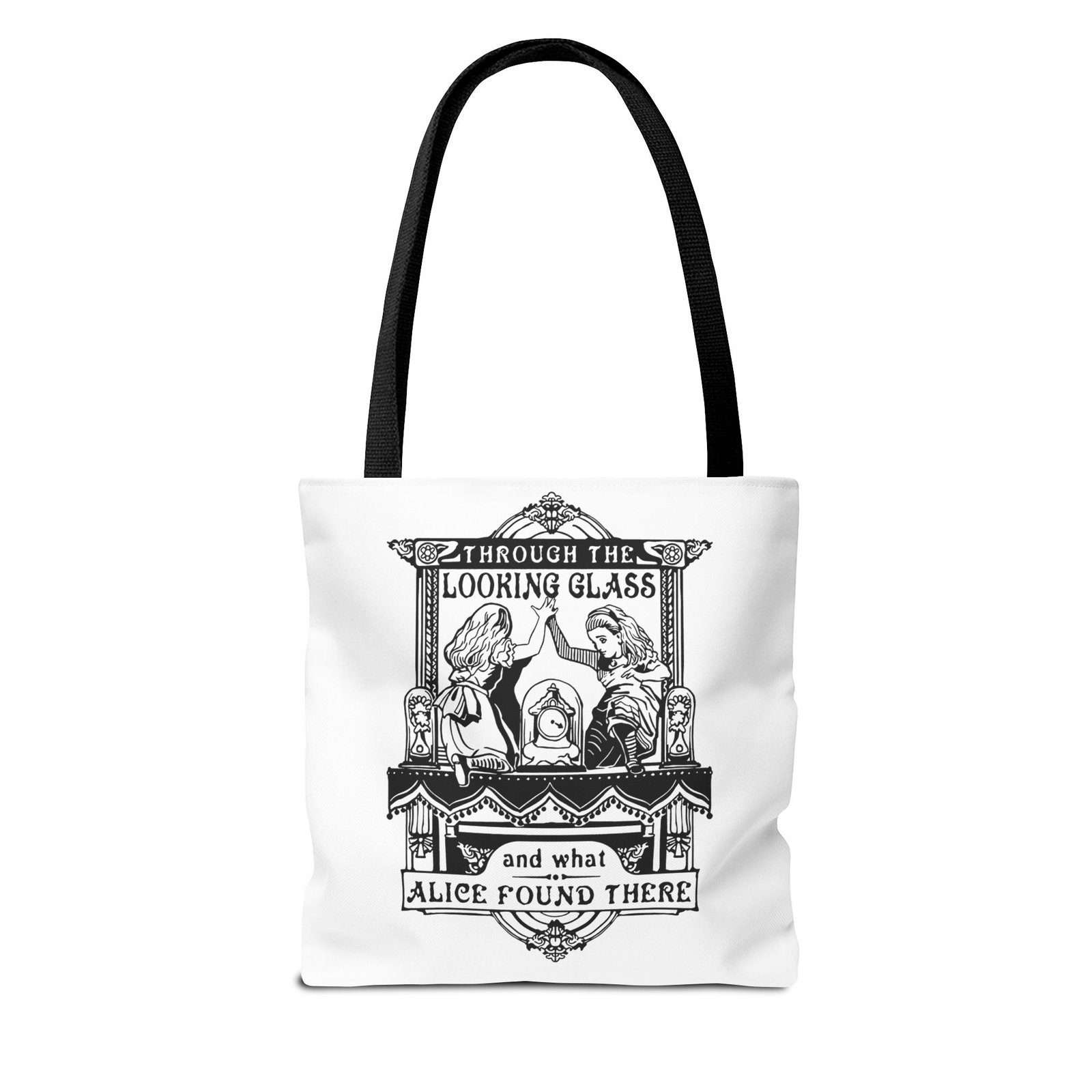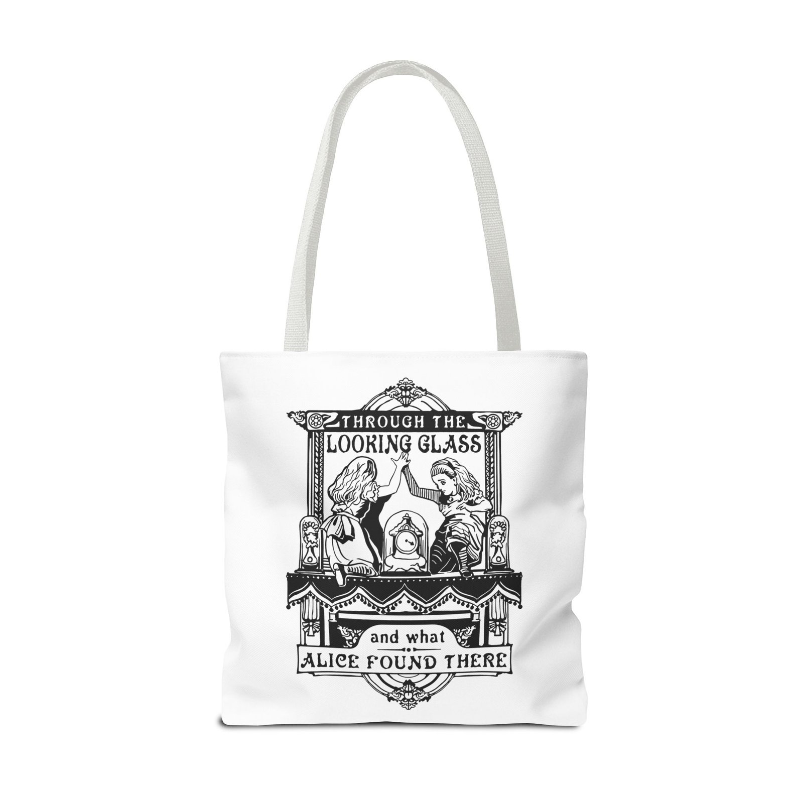 Alice Through the Looking Glass tote, Alice in Wonderland tote bag, vintage Alice illustration, black and white literary art, book lover tote, reusable tote bag, classic literature gift, Wonderland bag, Lewis Carroll art, storybook illustration tote, whimsical tote bag, cottagecore accessory, aesthetic book bag, fantasy literature tote
