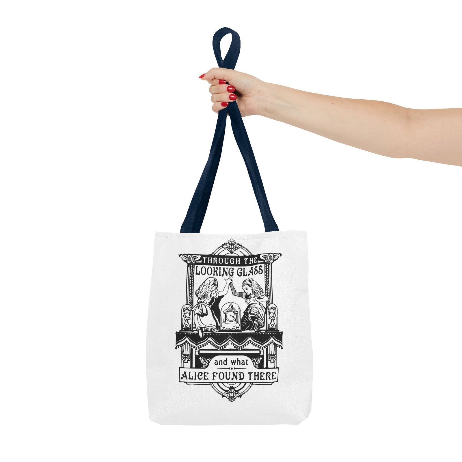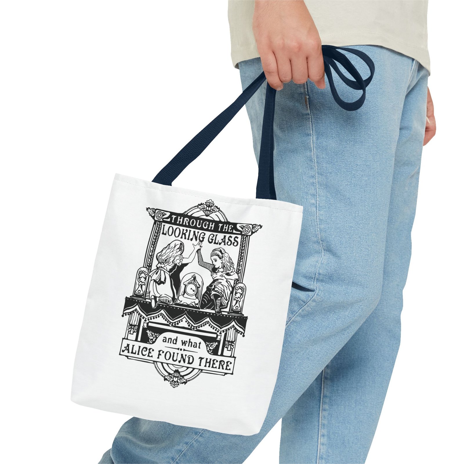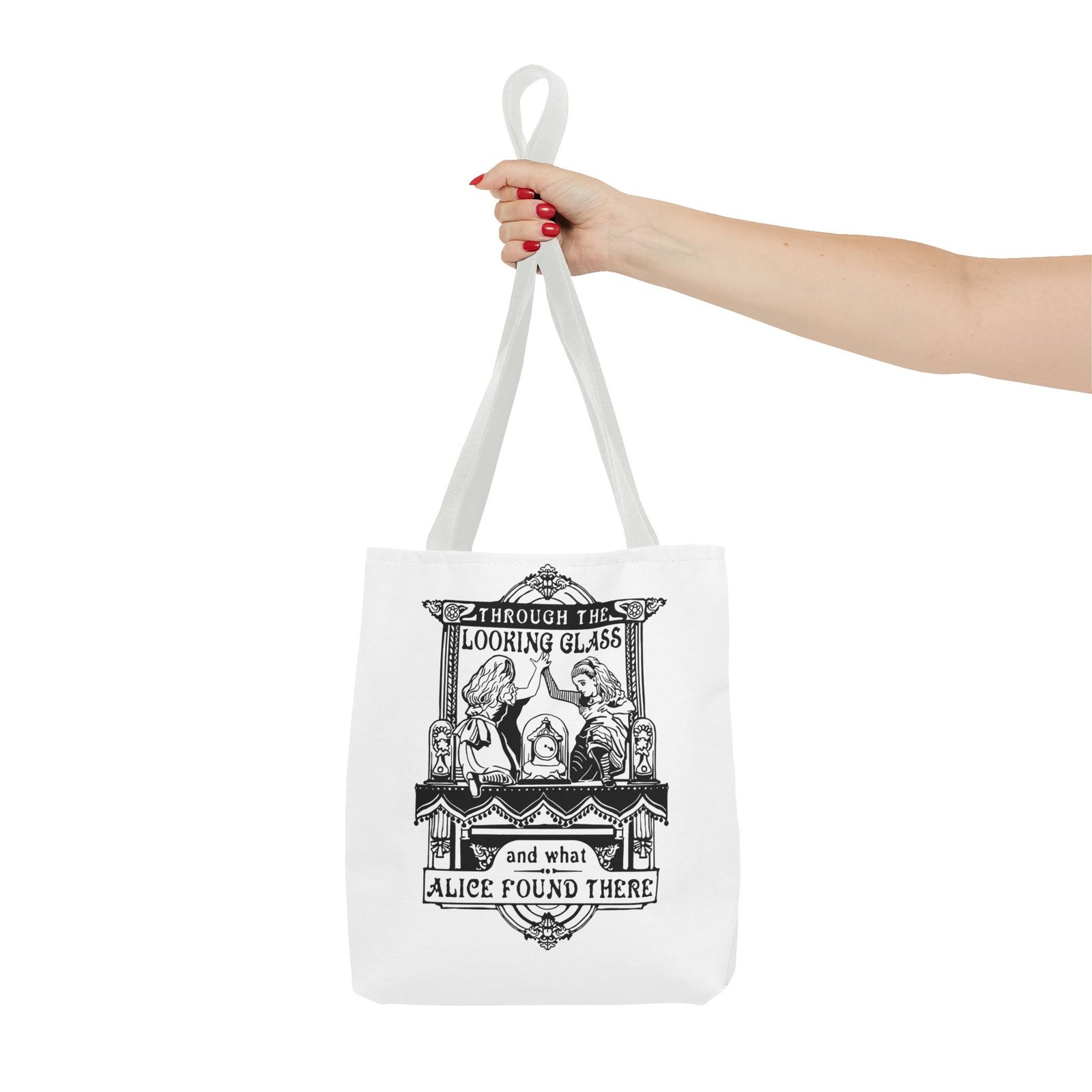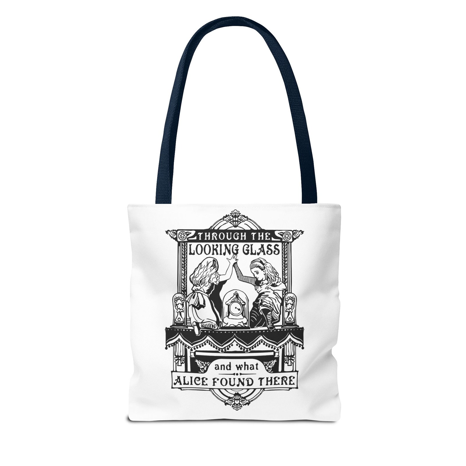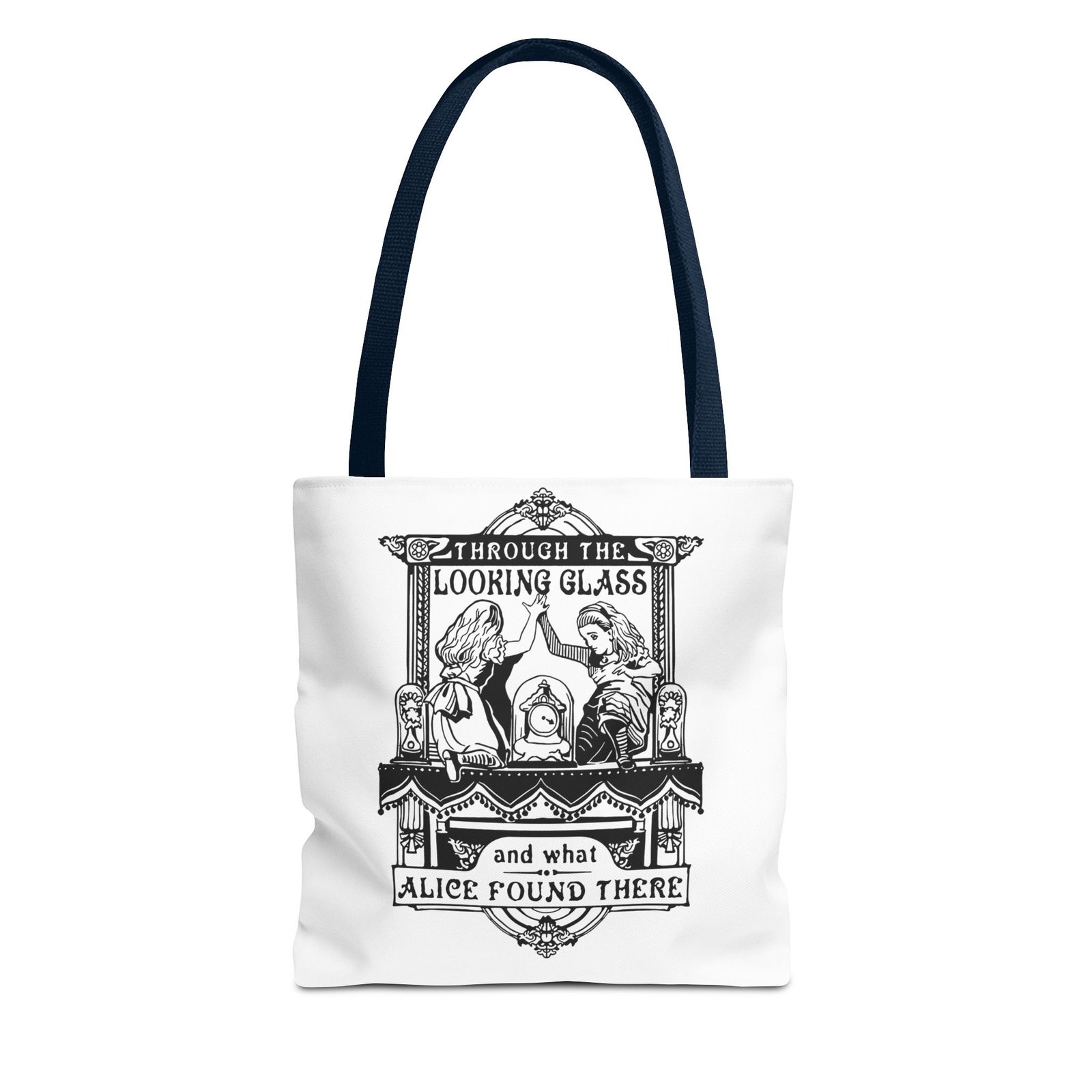 Alice Through the Looking Glass tote, Alice in Wonderland tote bag, vintage Alice illustration, black and white literary art, book lover tote, reusable tote bag, classic literature gift, Wonderland bag, Lewis Carroll art, storybook illustration tote, whimsical tote bag, cottagecore accessory, aesthetic book bag, fantasy literature tote