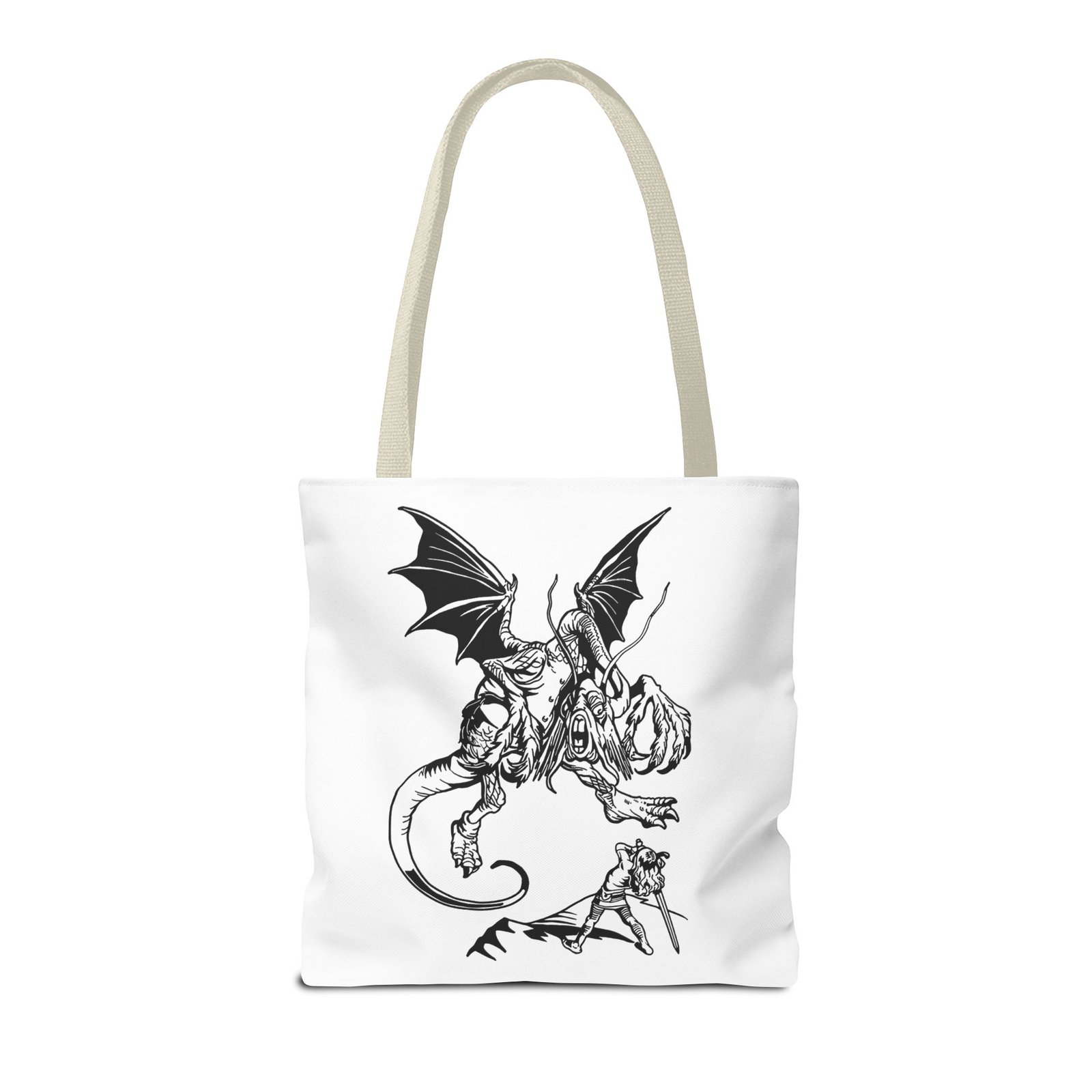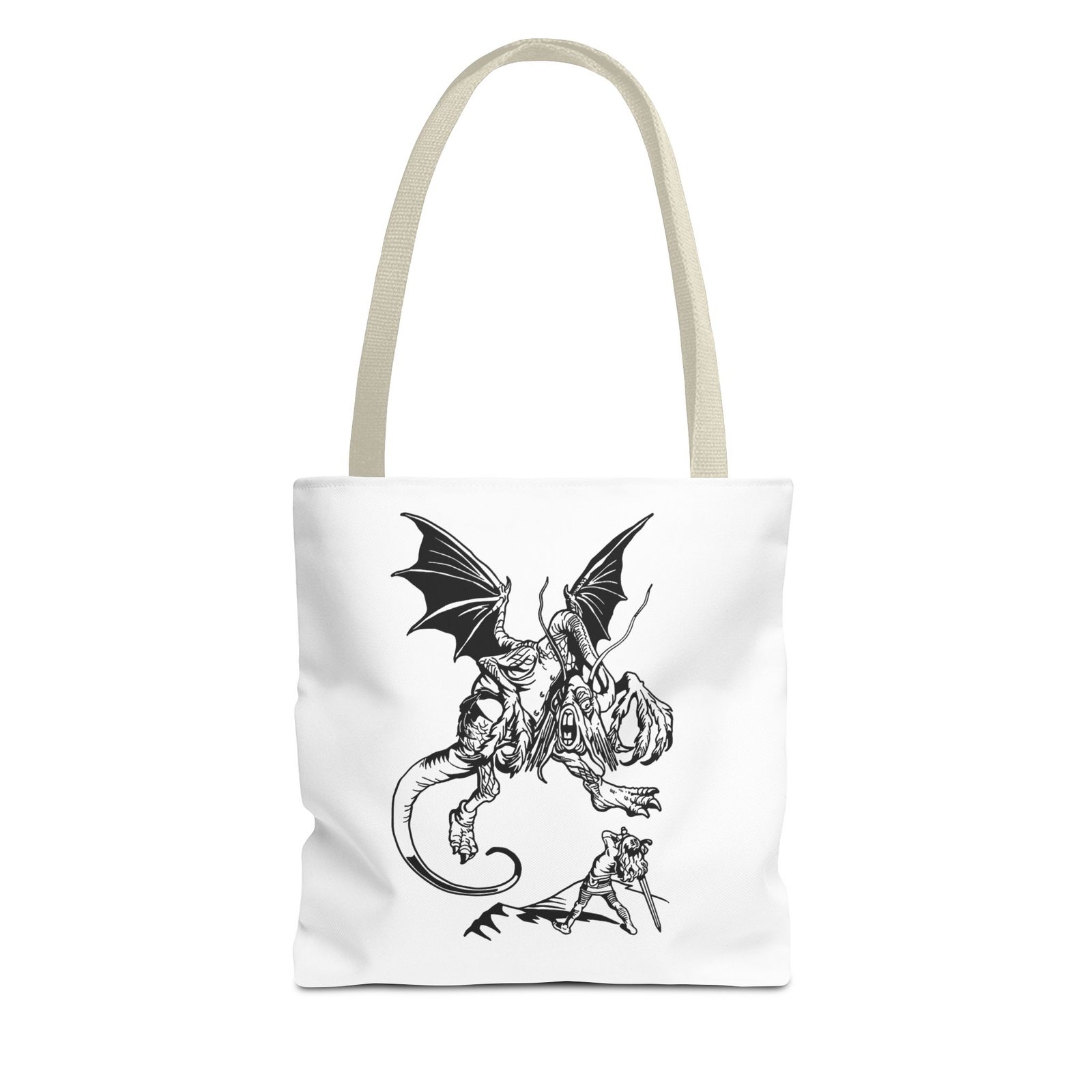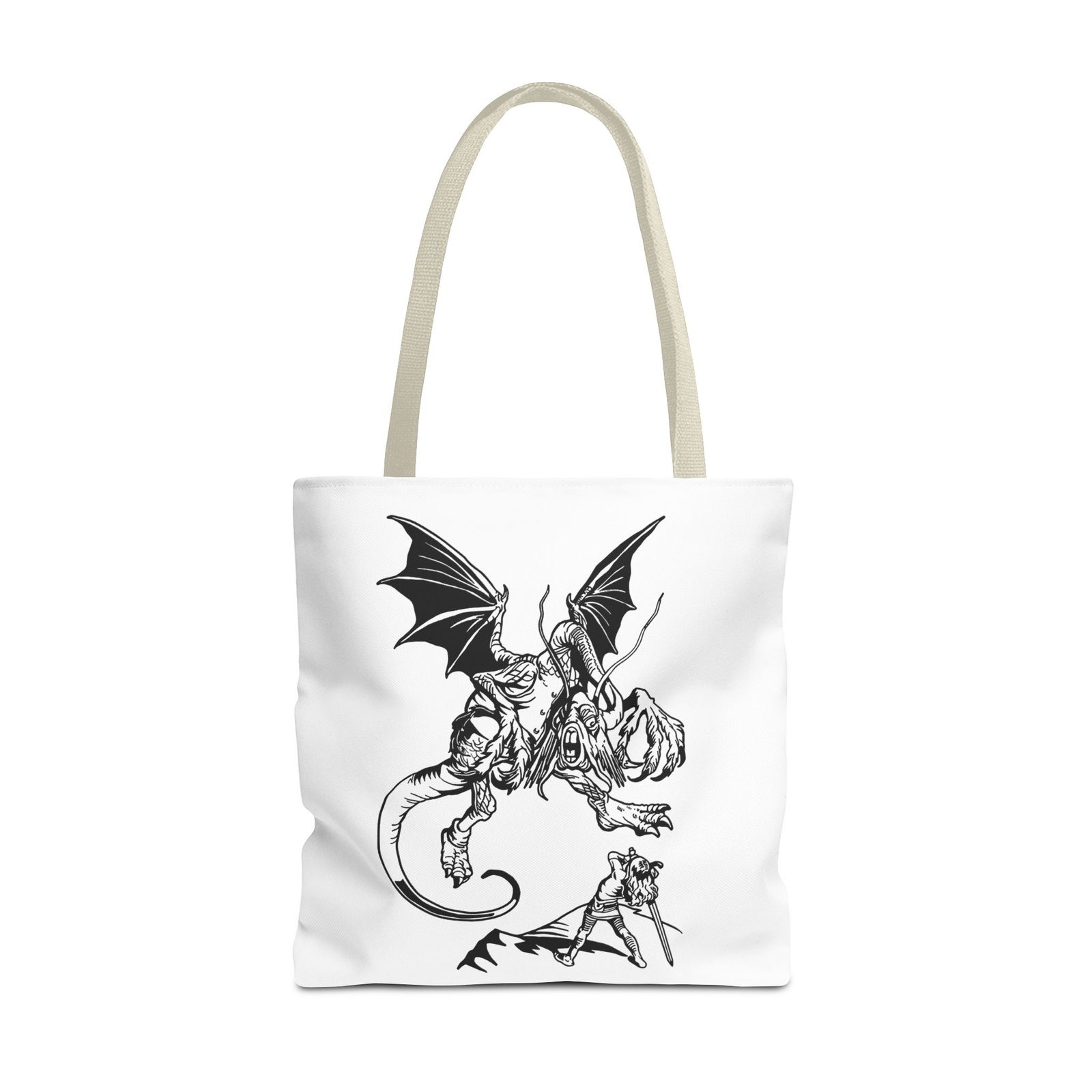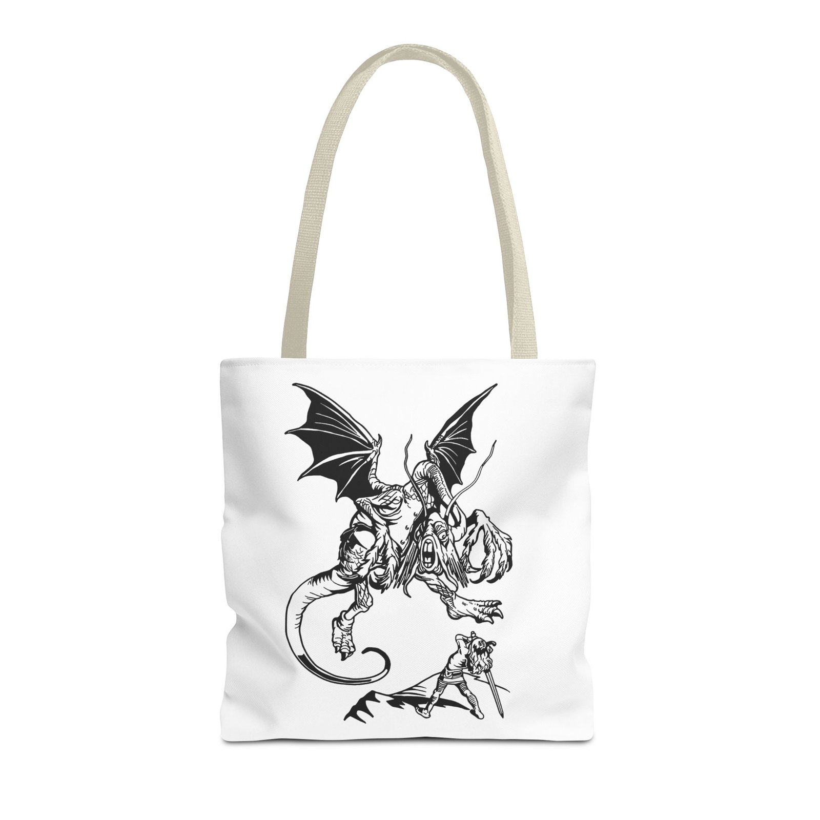 Alice Jabberwocky tote, Alice vs Jabberwocky bag, Through the Looking Glass tote, Alice in Wonderland tote bag, vintage illustration tote, black and white literary art, book lover tote, reusable tote bag, classic literature gift, Wonderland bag, Lewis Carroll art, storybook illustration tote, fantasy literature tote, gothic fairytale accessory