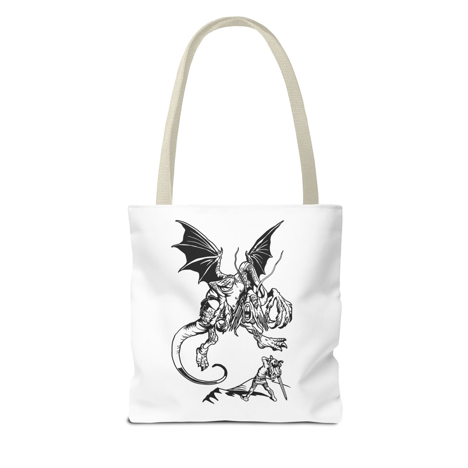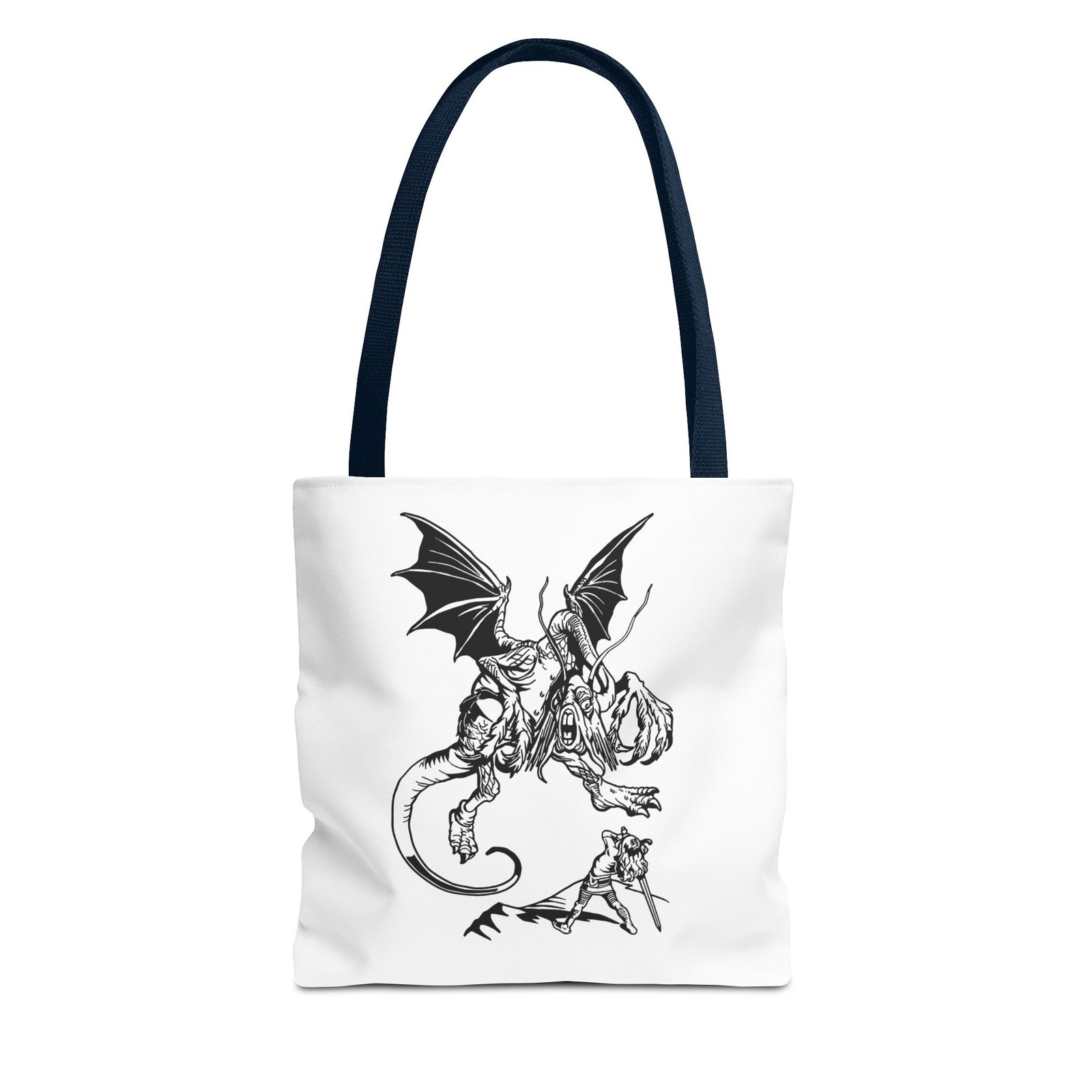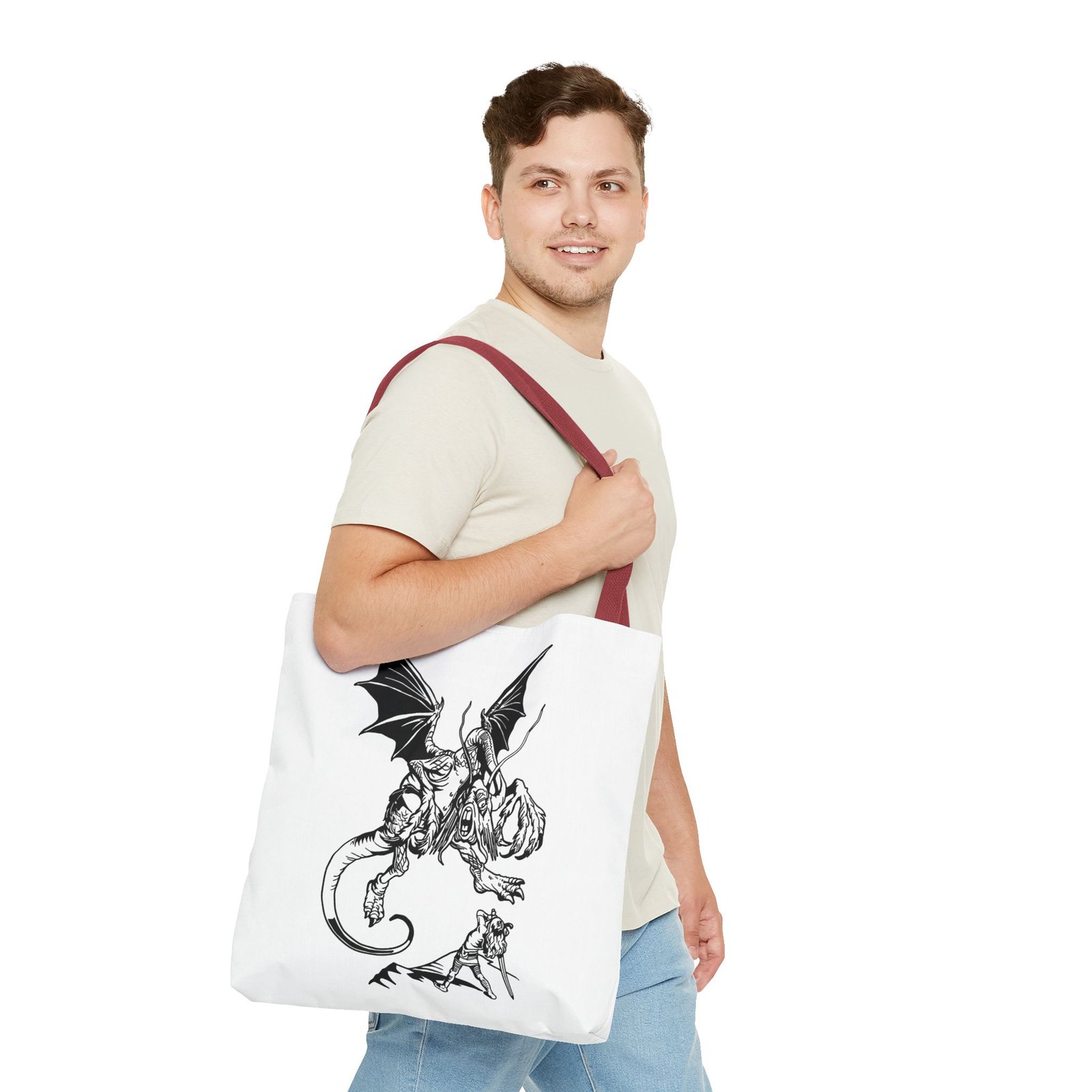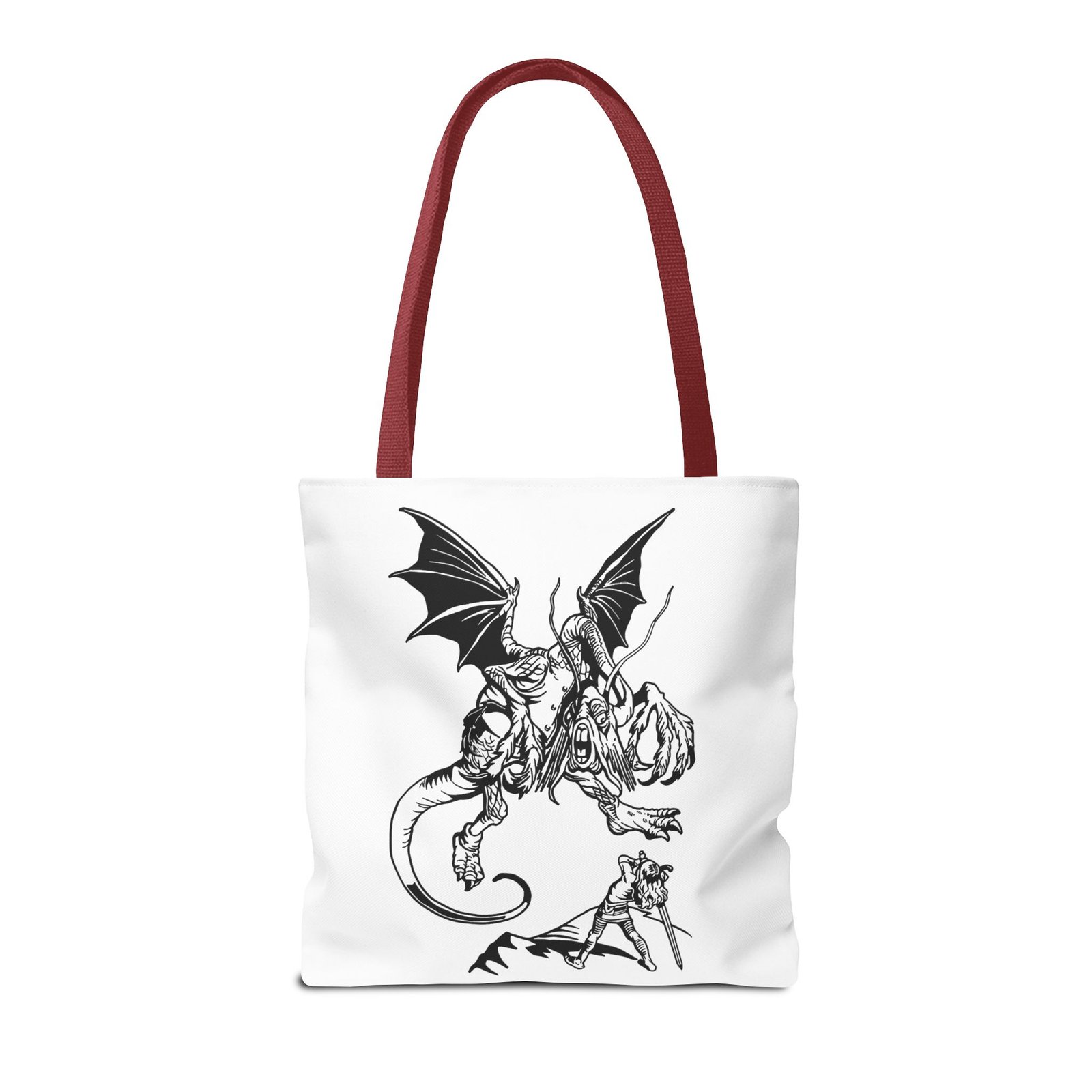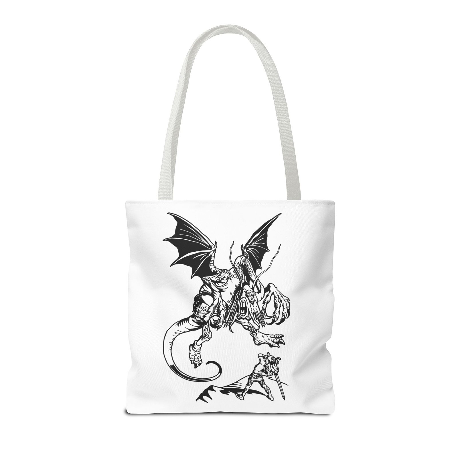 Alice Jabberwocky tote, Alice vs Jabberwocky bag, Through the Looking Glass tote, Alice in Wonderland tote bag, vintage illustration tote, black and white literary art, book lover tote, reusable tote bag, classic literature gift, Wonderland bag, Lewis Carroll art, storybook illustration tote, fantasy literature tote, gothic fairytale accessory