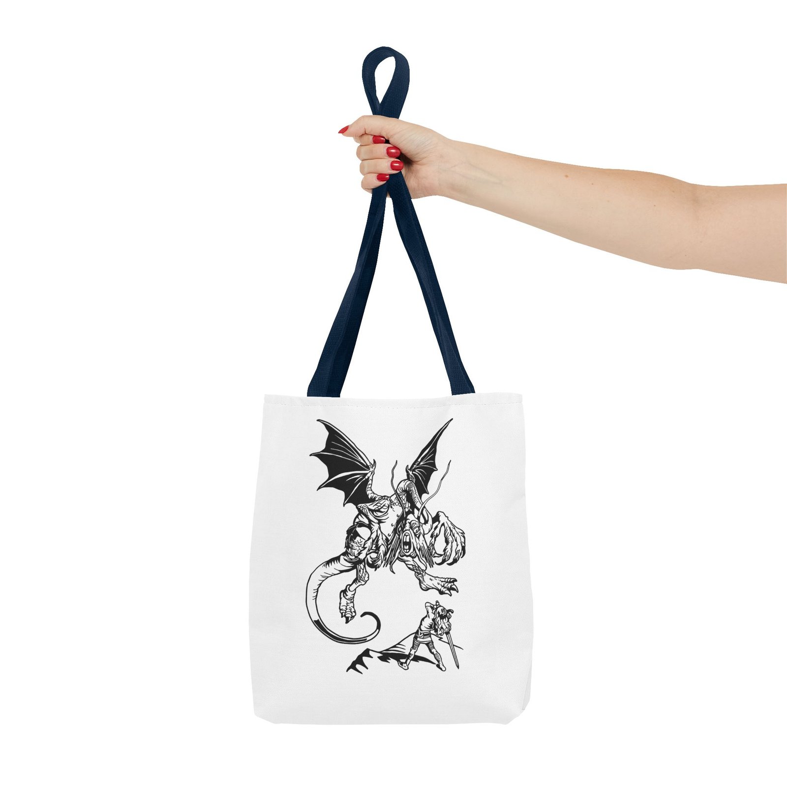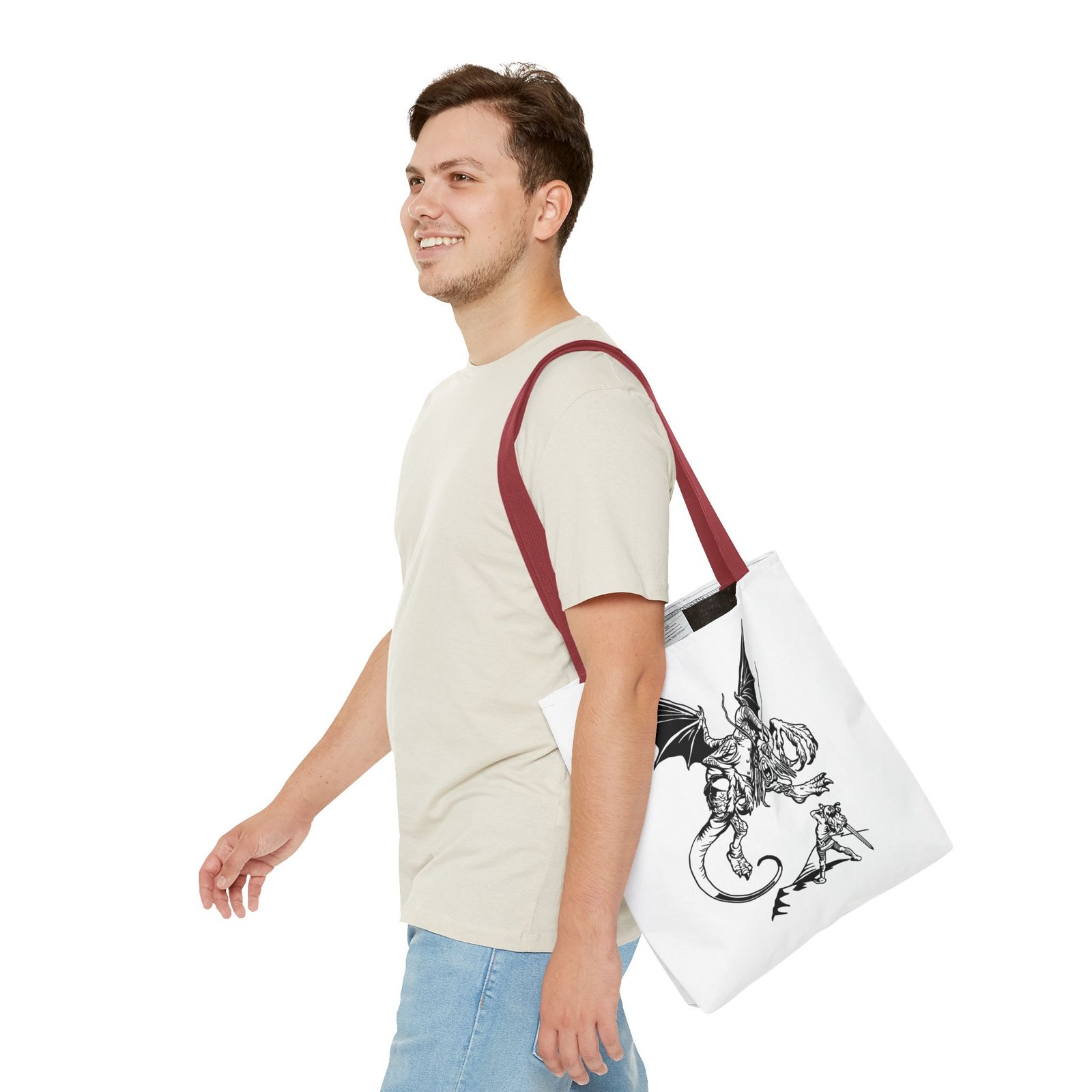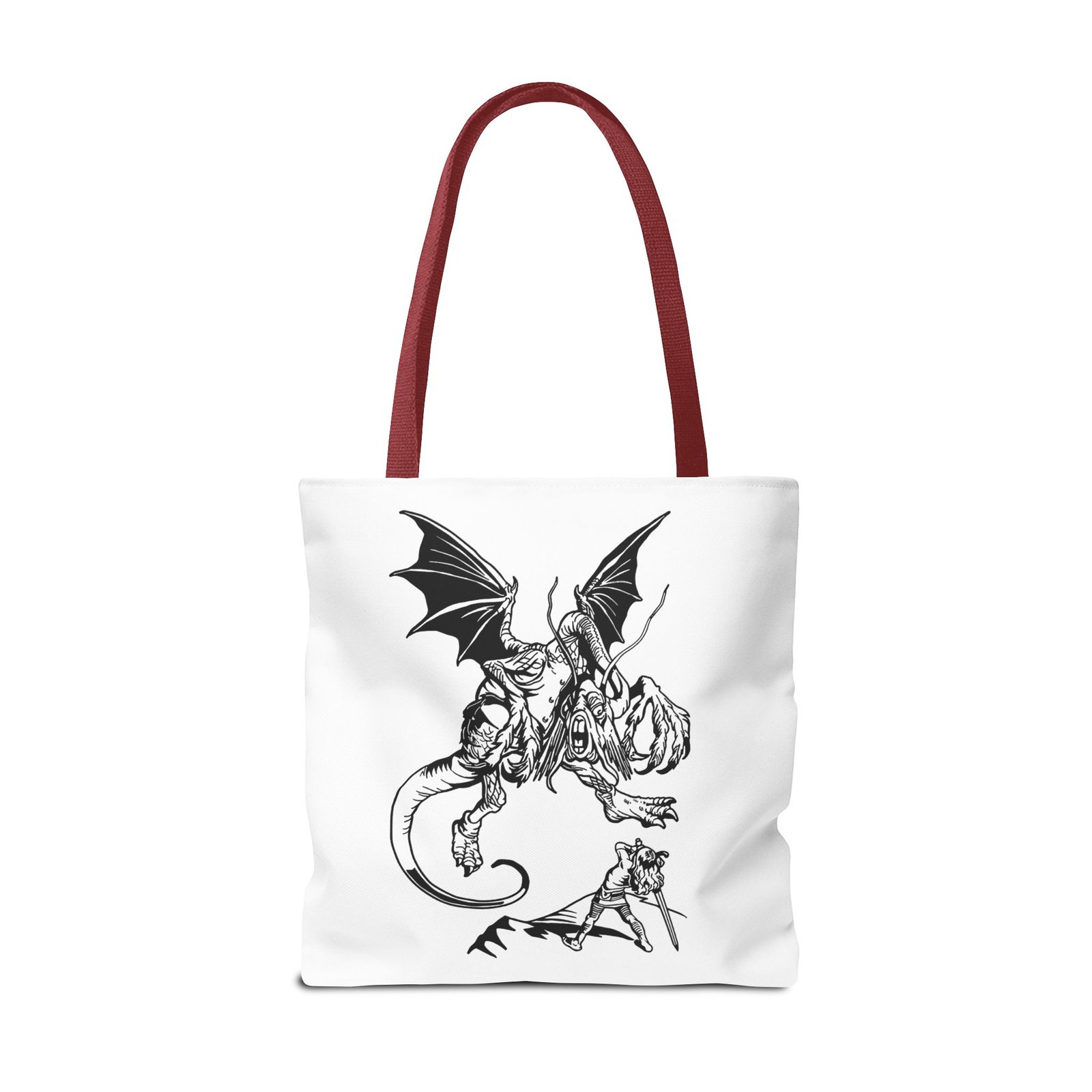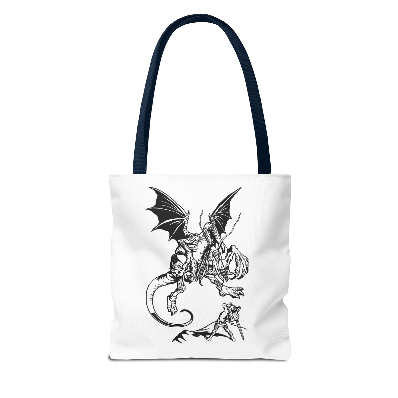 Alice Jabberwocky tote, Alice vs Jabberwocky bag, Through the Looking Glass tote, Alice in Wonderland tote bag, vintage illustration tote, black and white literary art, book lover tote, reusable tote bag, classic literature gift, Wonderland bag, Lewis Carroll art, storybook illustration tote, fantasy literature tote, gothic fairytale accessory
