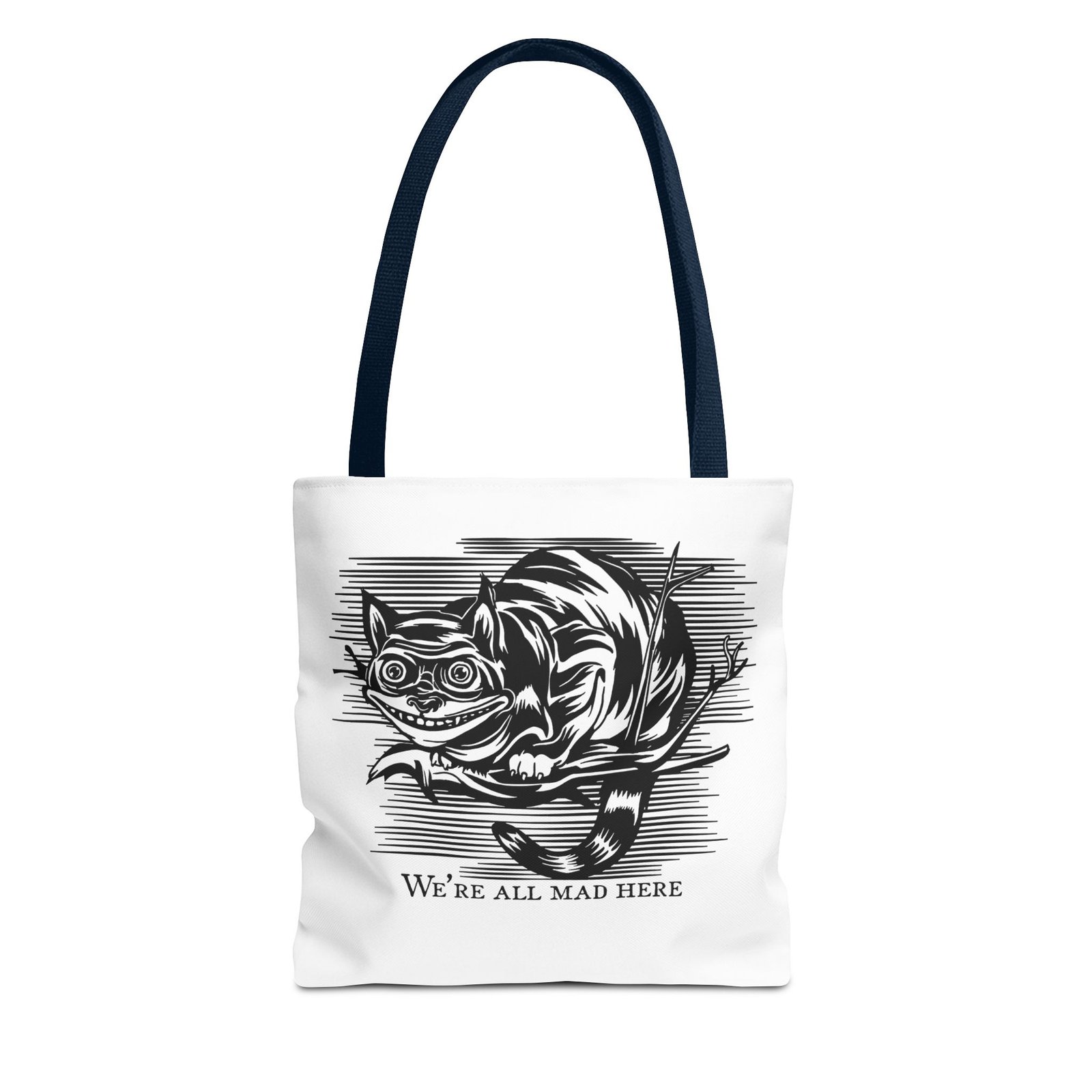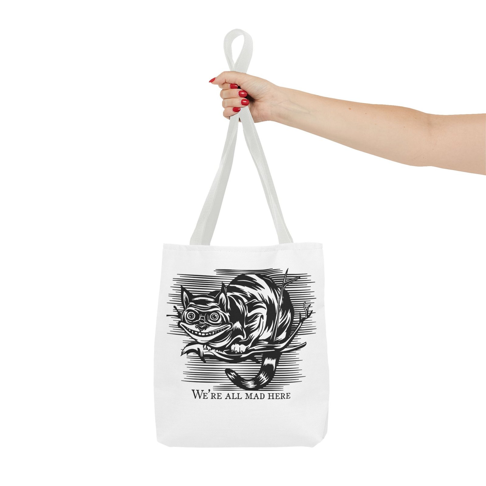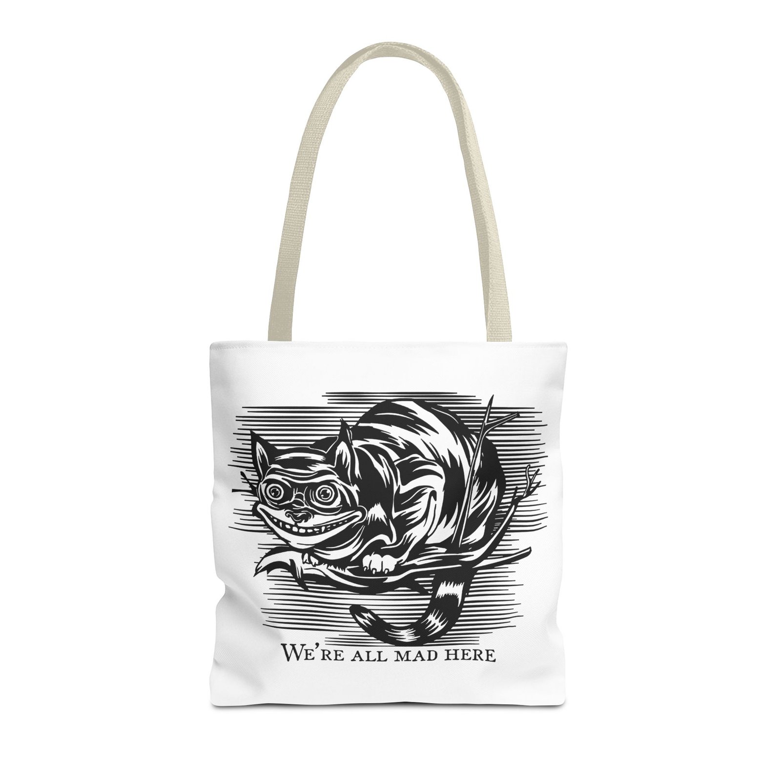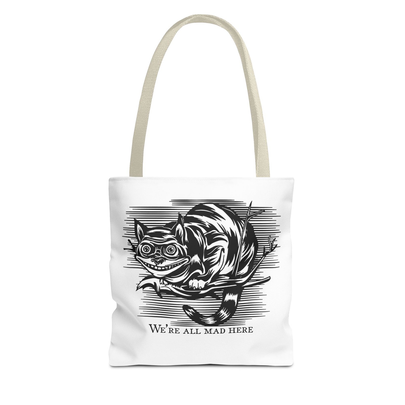 Cheshire Cat tote, Alice in Wonderland tote bag, vintage Alice illustration, black and white literary art, book lover tote, reusable tote bag, classic literature gift, Wonderland bag, Lewis Carroll art, storybook illustration tote, whimsical tote bag, cottagecore accessory, aesthetic book bag, fantasy literature tote