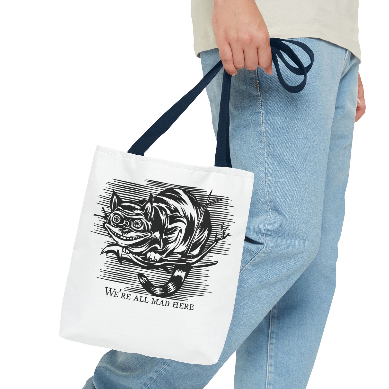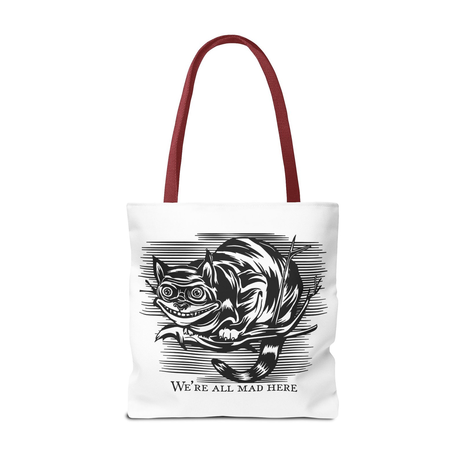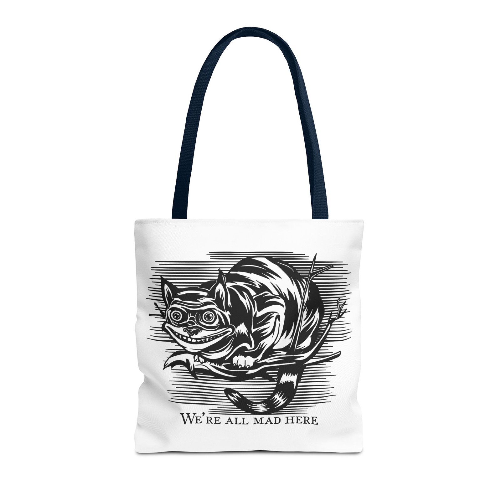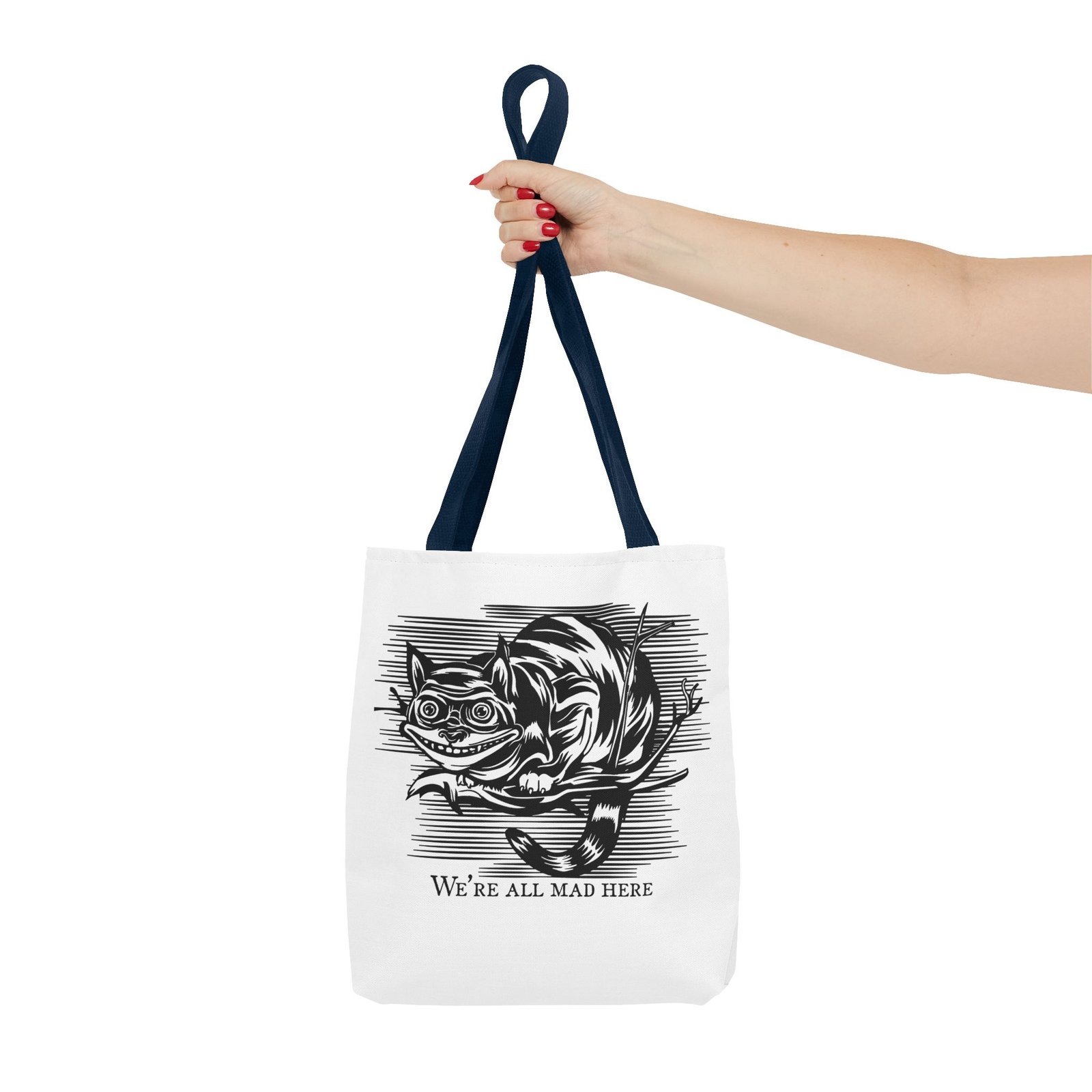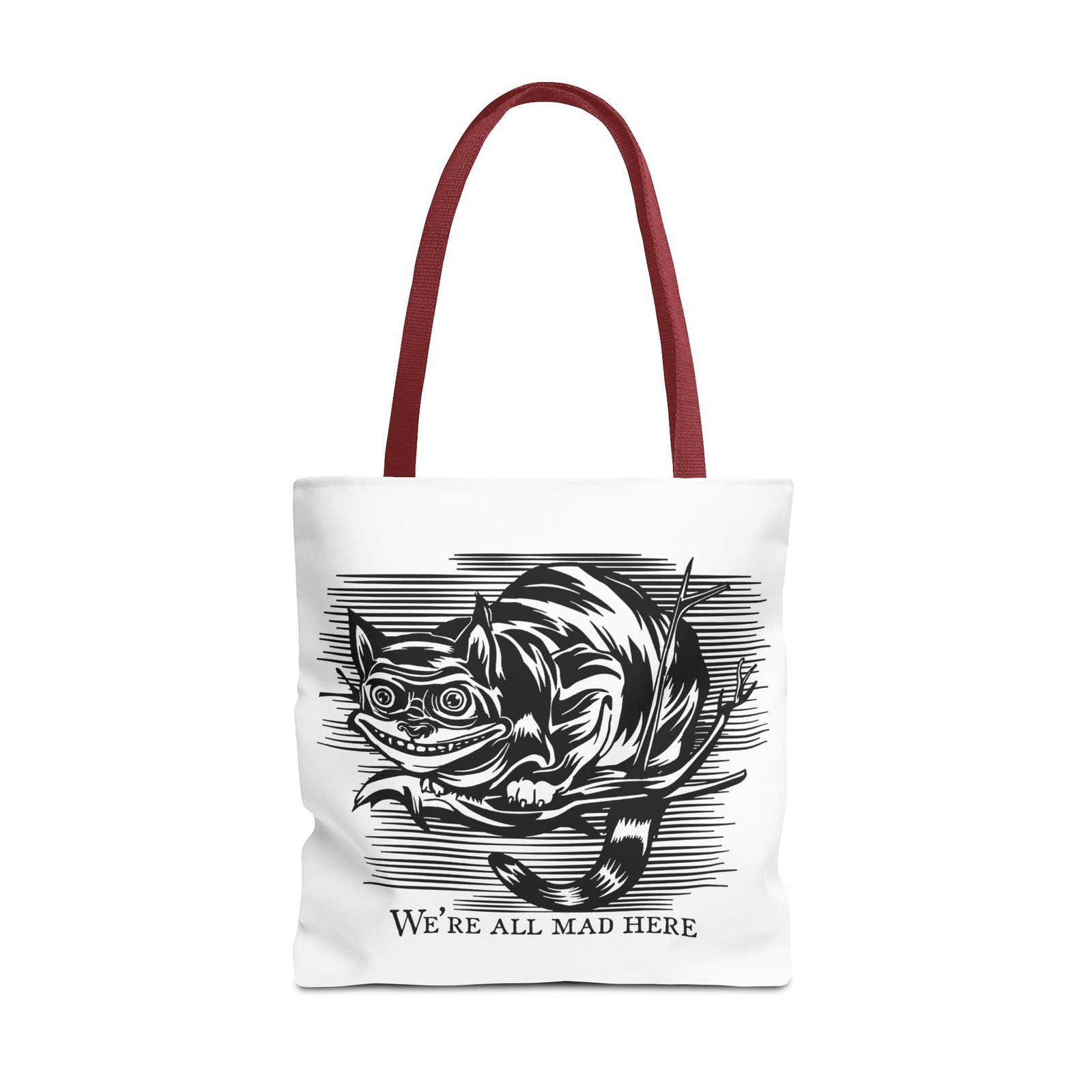 Cheshire Cat tote, Alice in Wonderland tote bag, vintage Alice illustration, black and white literary art, book lover tote, reusable tote bag, classic literature gift, Wonderland bag, Lewis Carroll art, storybook illustration tote, whimsical tote bag, cottagecore accessory, aesthetic book bag, fantasy literature tote