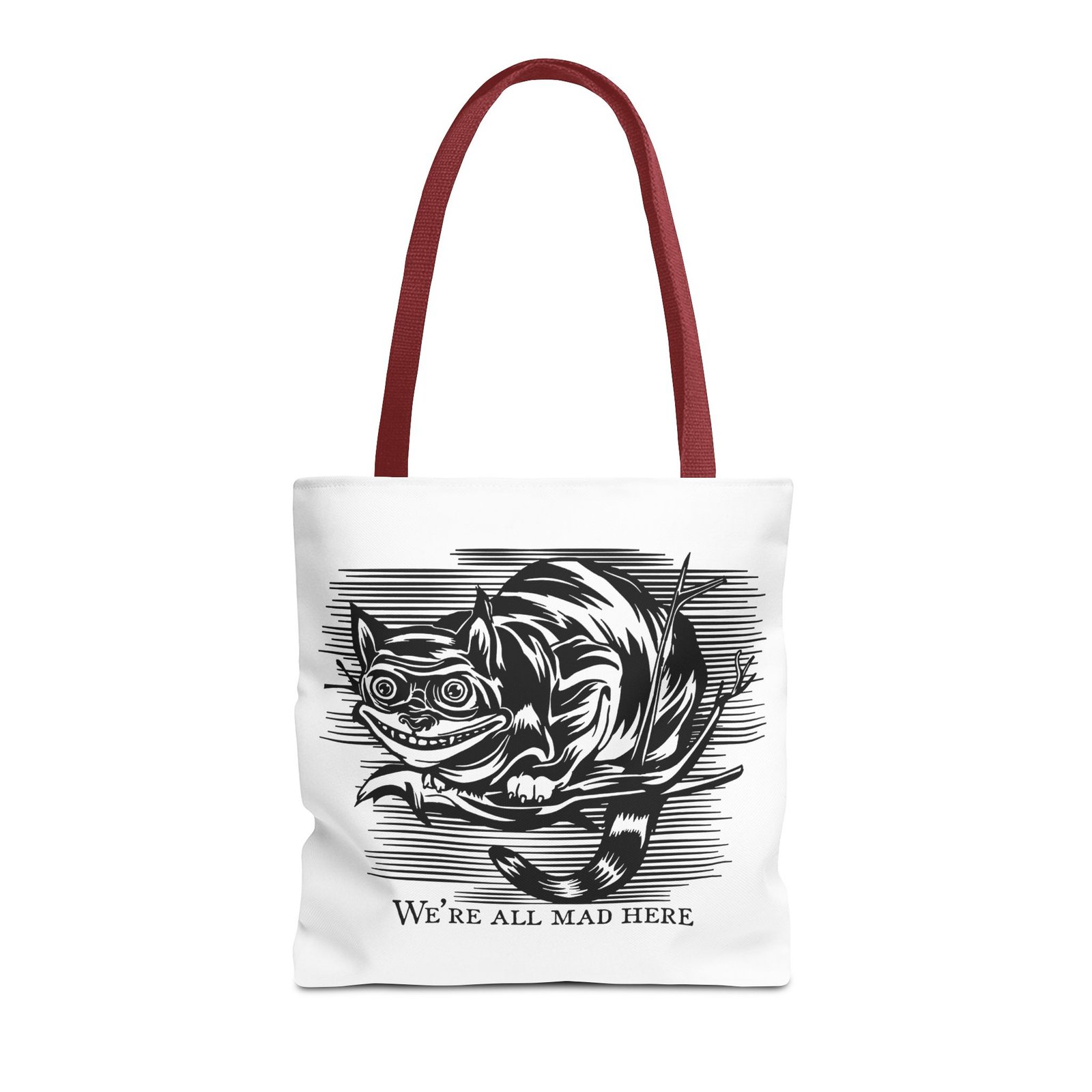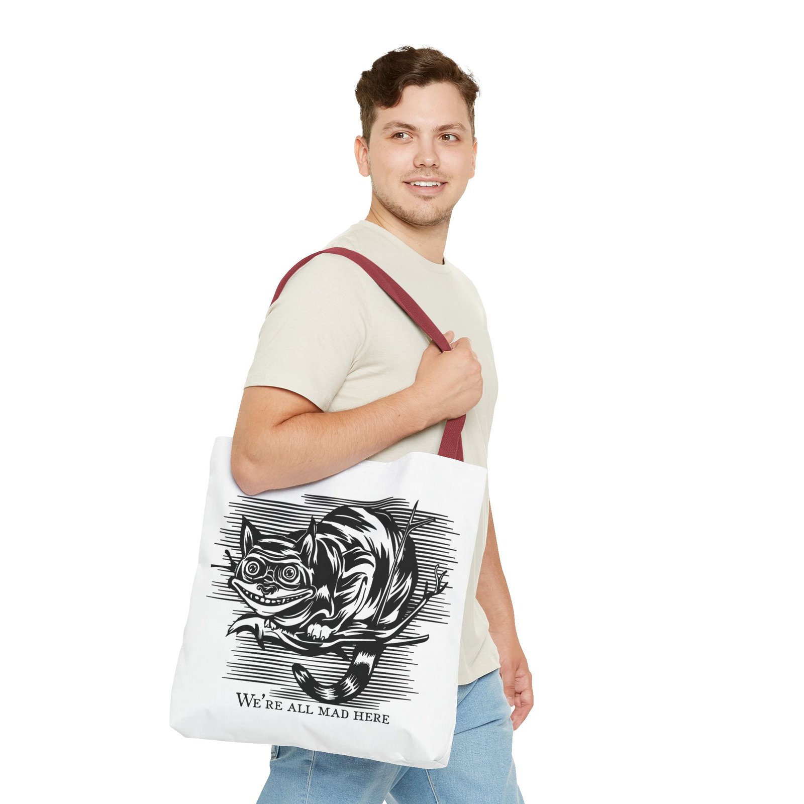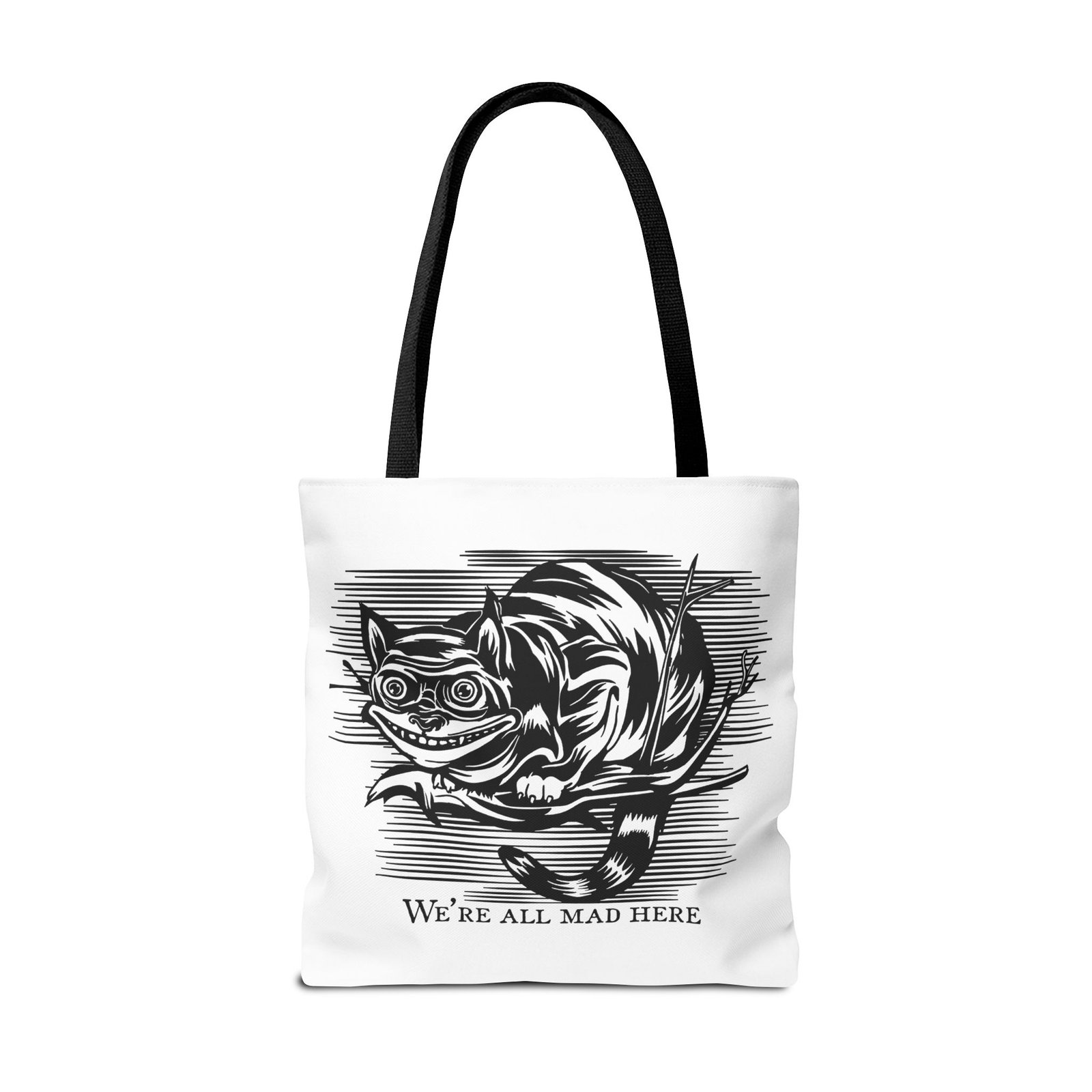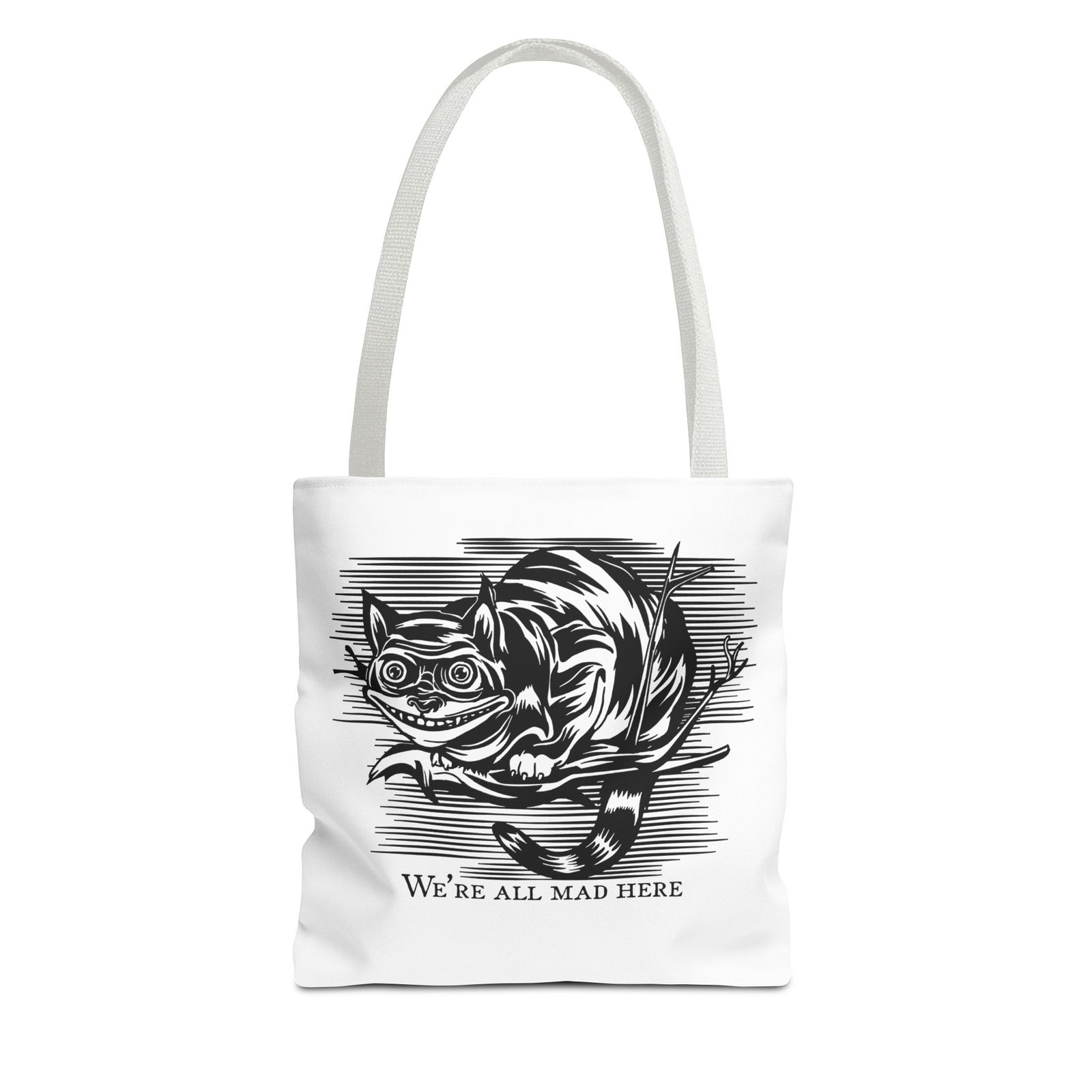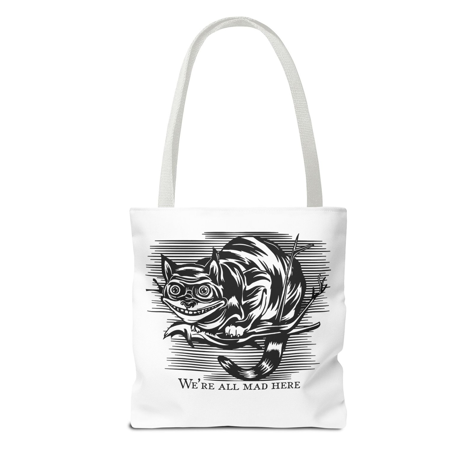 Add a touch of mischievous Wonderland charm to your everyday carry with this Cheshire Cat tote bag. Featuring a vintage black-and-white illustration of the iconic Cheshire Cat from Alice’s Adventures in Wonderland by Lewis Carroll, this design captures the cat’s unforgettable grin and timeless storybook appeal.