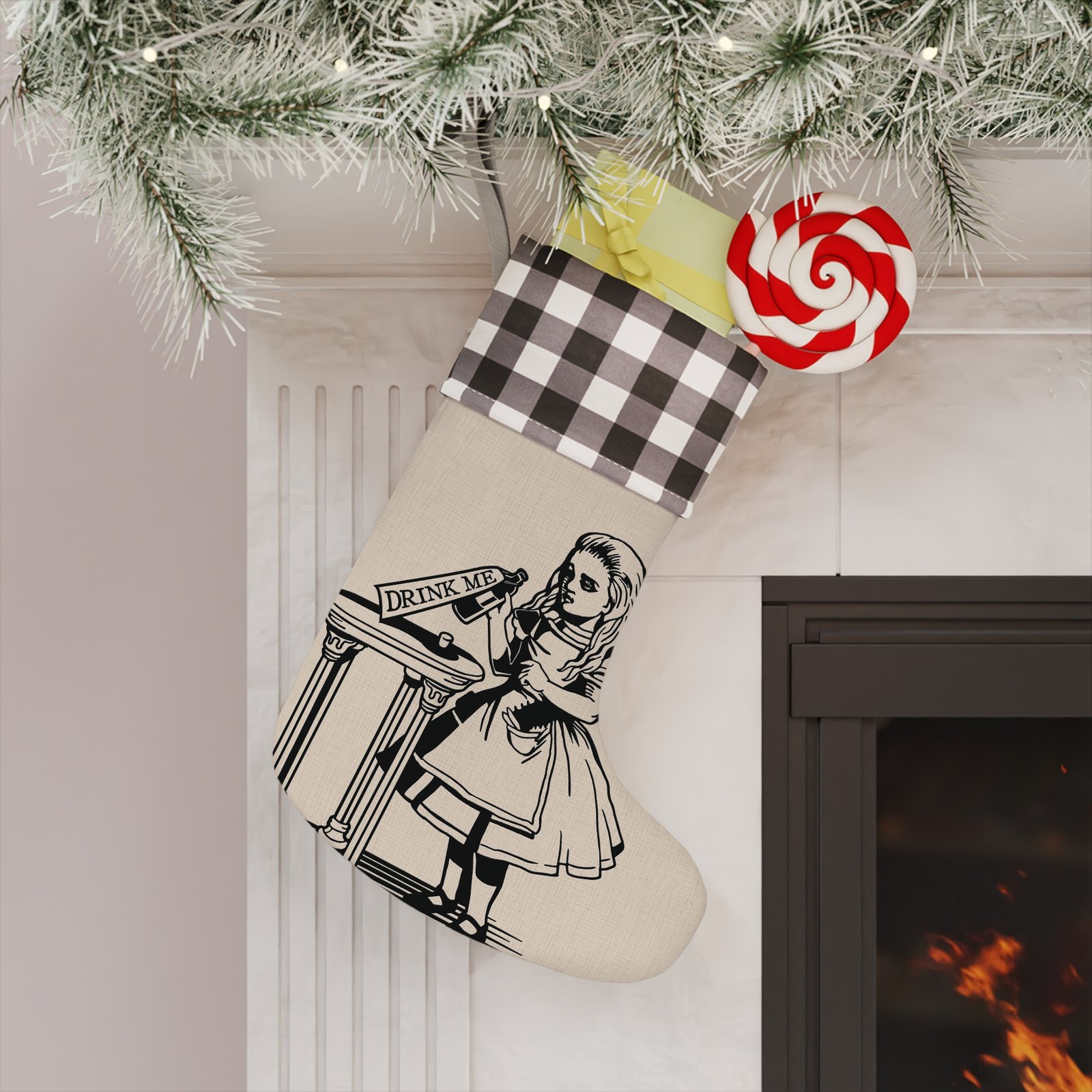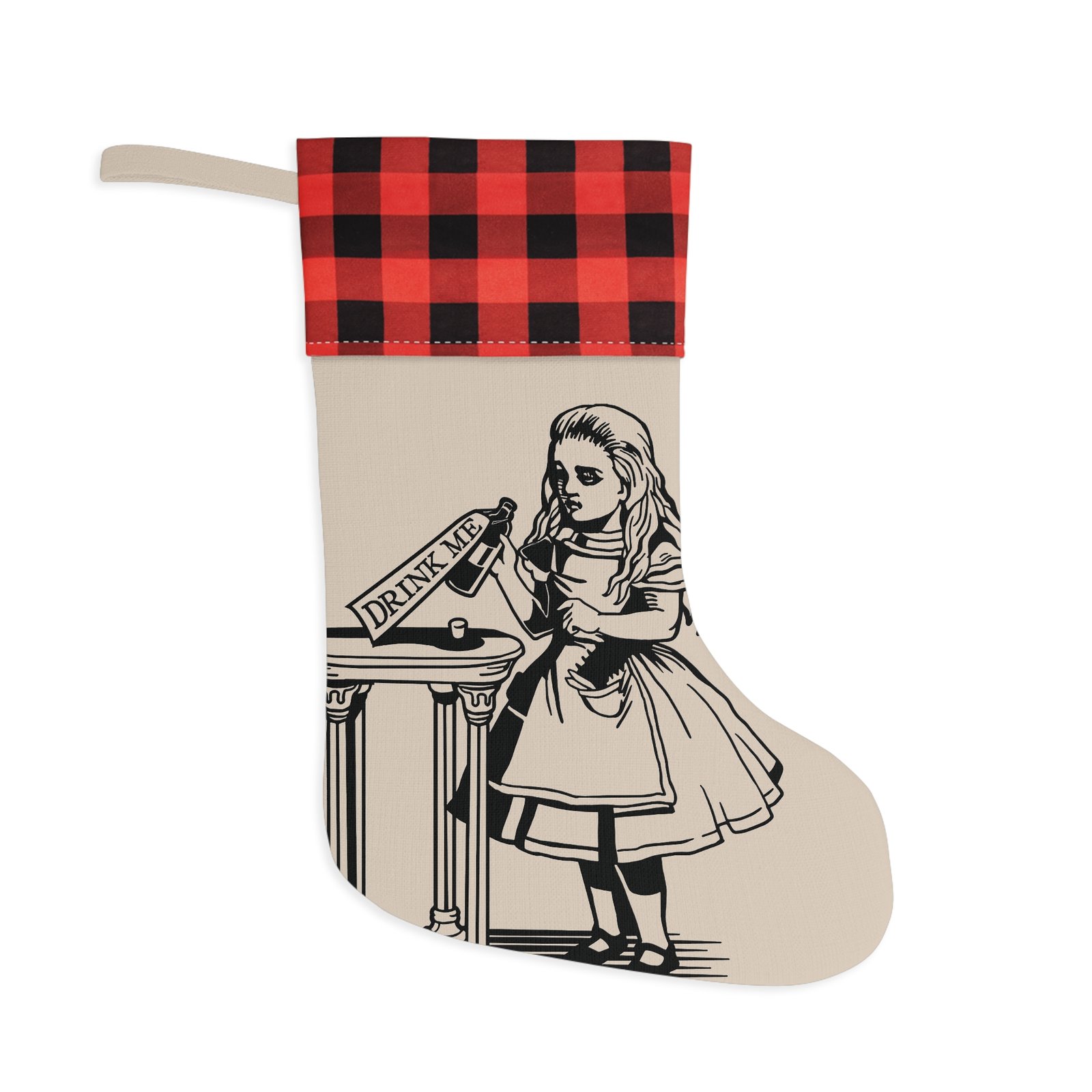 Drink Me bottle Christmas stocking, Alice in Wonderland stocking, Wonderland holiday decor, classic Alice stocking, whimsical Christmas stocking, vintage storybook Christmas decoration, Lewis Carroll holiday décor, fantasy Christmas stocking, Wonderland gift idea, fireplace mantel decor, holiday stocking decor, Alice themed Christmas