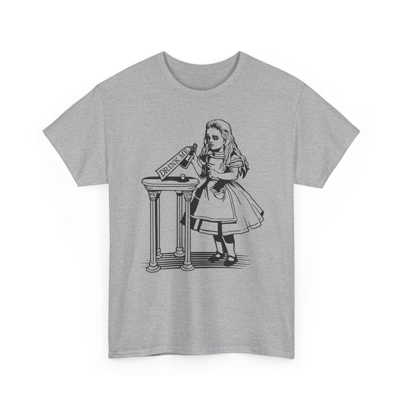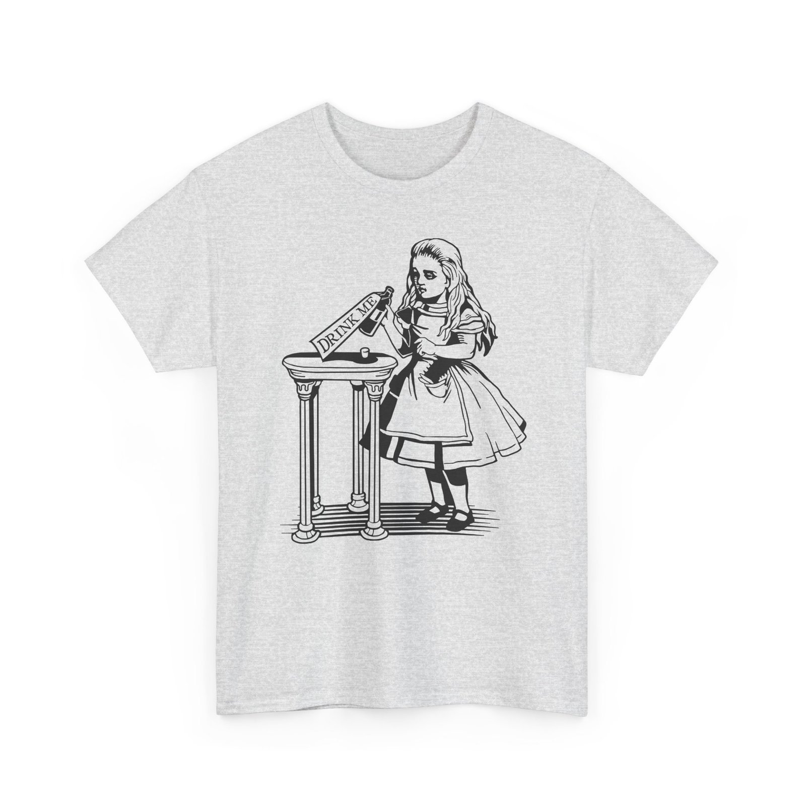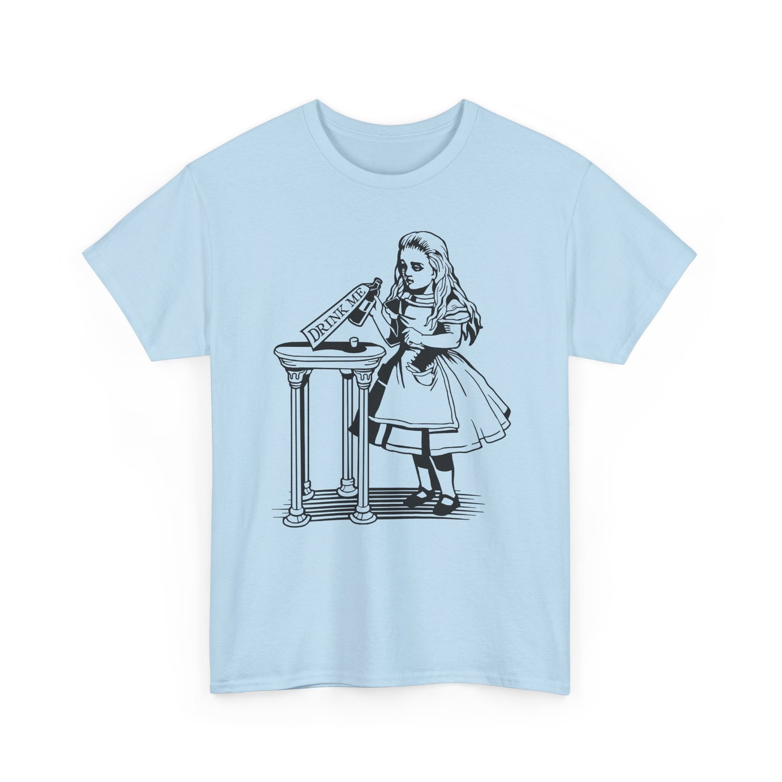 Drink Me t-shirt, Alice in Wonderland shirt, classic literature tee, Wonderland bottle shirt, unisex heavy cotton tee, Lewis Carroll shirt, vintage storybook shirt, literary gift idea, whimsical graphic tee, book lover t-shirt, fantasy story tee, Wonderland apparel, Alice themed gift, classic illustration shirt