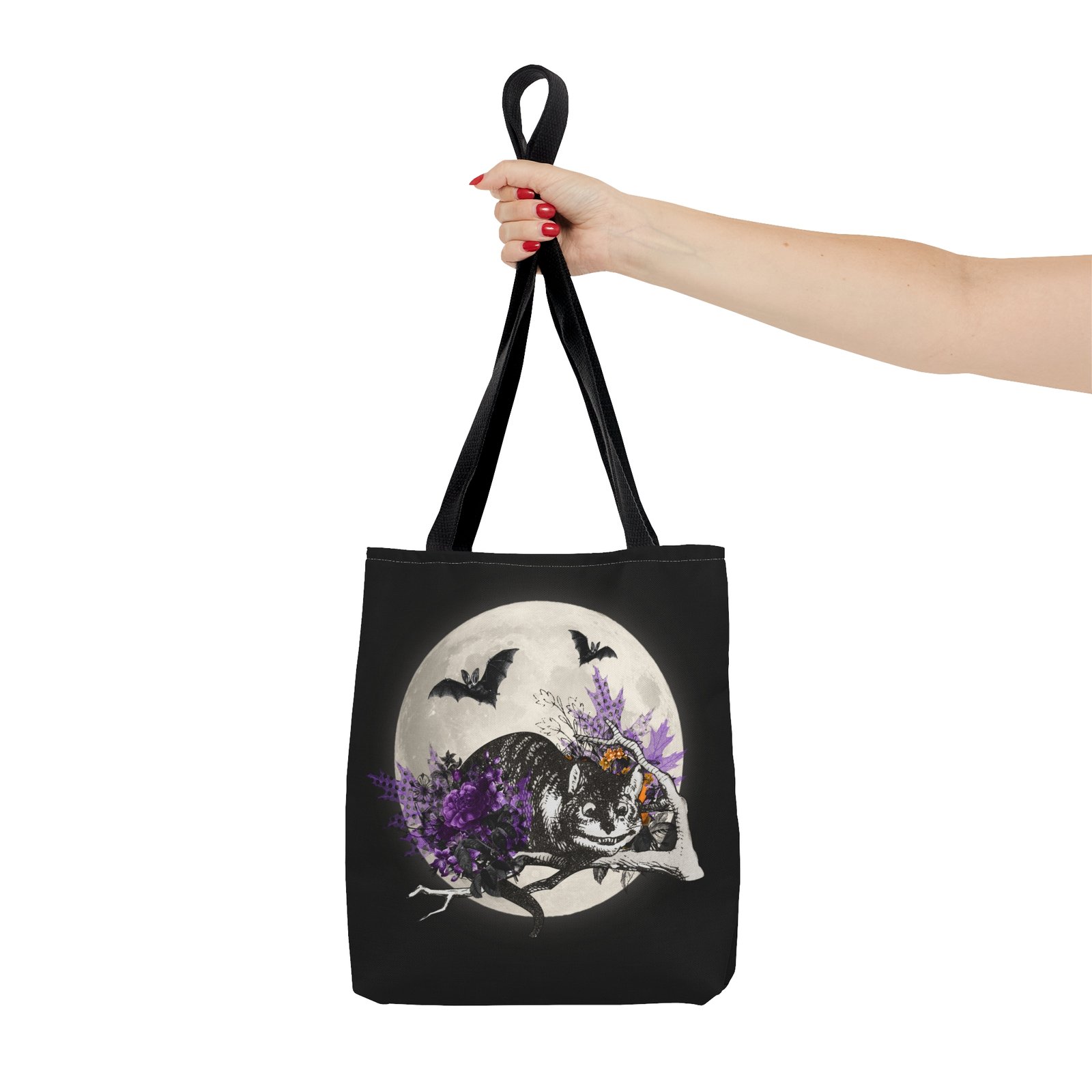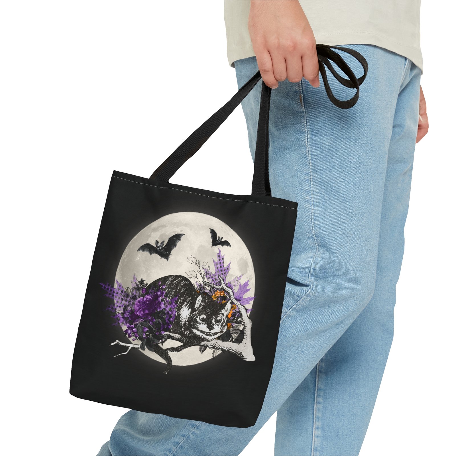 Halloween Cheshire Cat tote, Alice in Wonderland bag, spooky tote bag, Wonderland Halloween accessory, trick or treat tote, reusable fantasy bag, whimsical Cheshire Cat design, spooky season tote, book lover tote, magical Wonderland tote, Halloween gift idea, grinning cat tote
