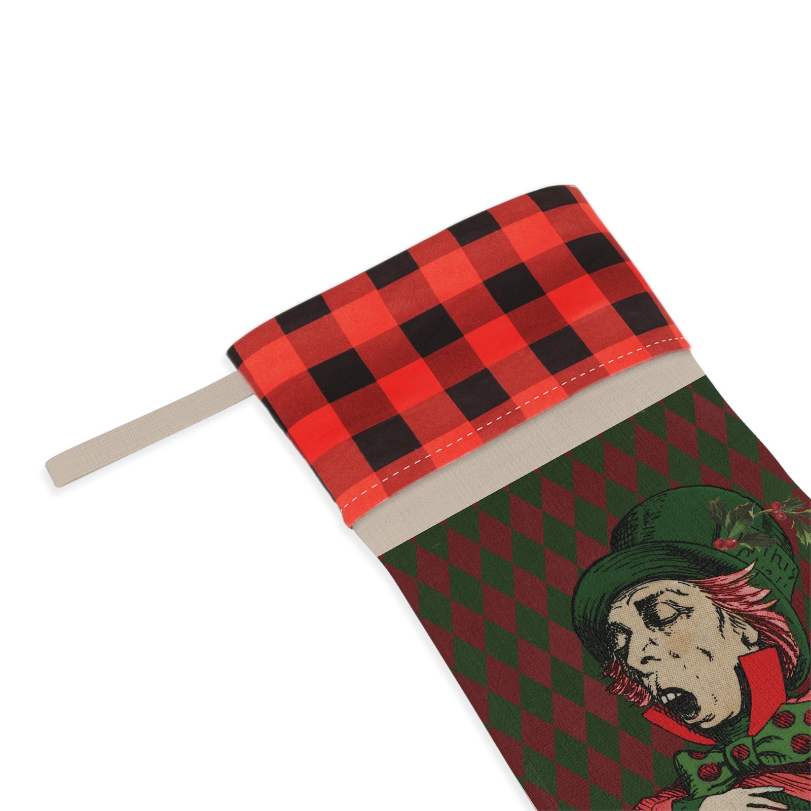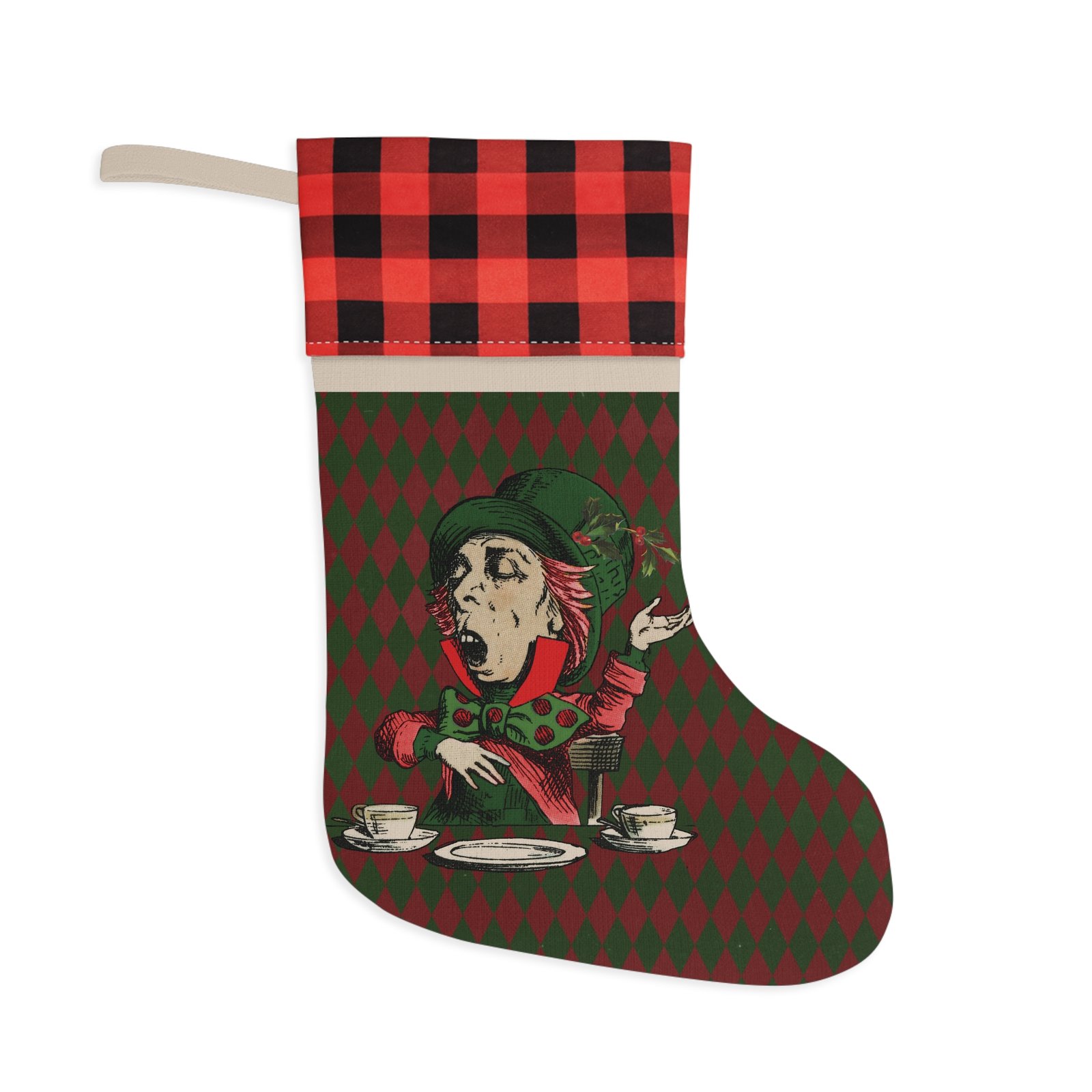 Mad Hatter Christmas stocking, Alice in Wonderland stocking, Wonderland holiday decor, classic Alice stocking, whimsical Christmas stocking, vintage storybook decoration, Lewis Carroll holiday decor, fantasy Christmas stocking, Wonderland fan gift, fireplace mantel decor, holiday stocking décor, Alice themed Christmas