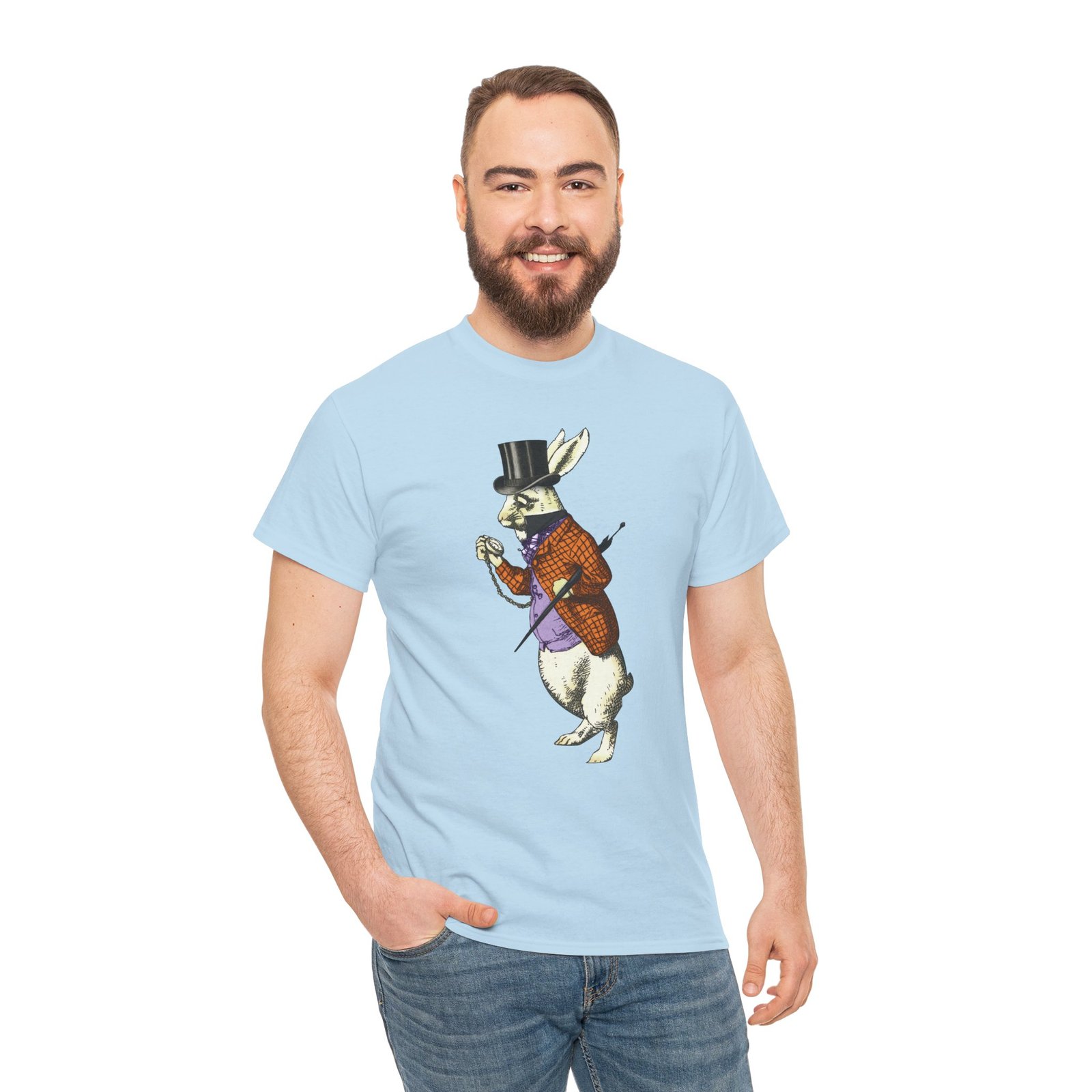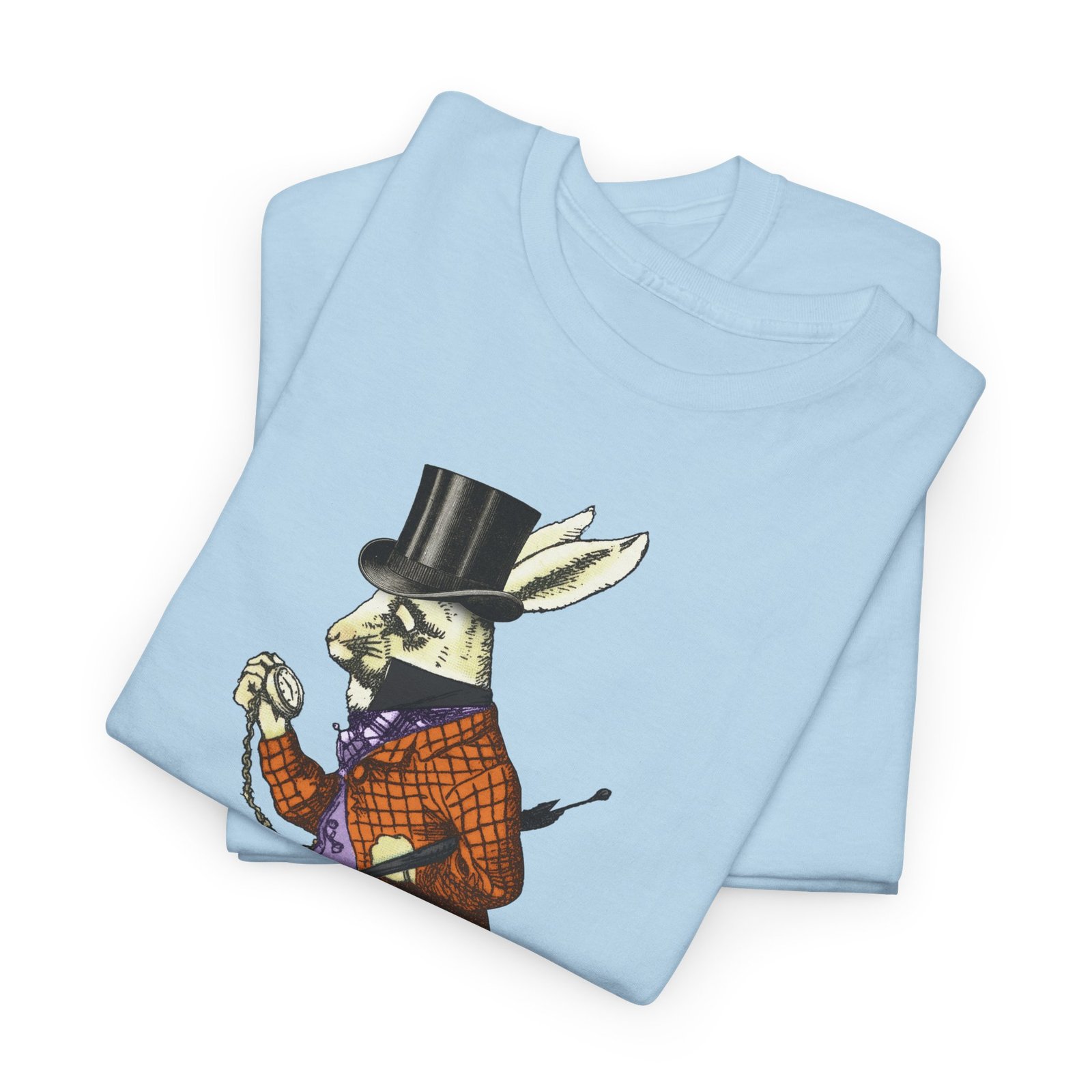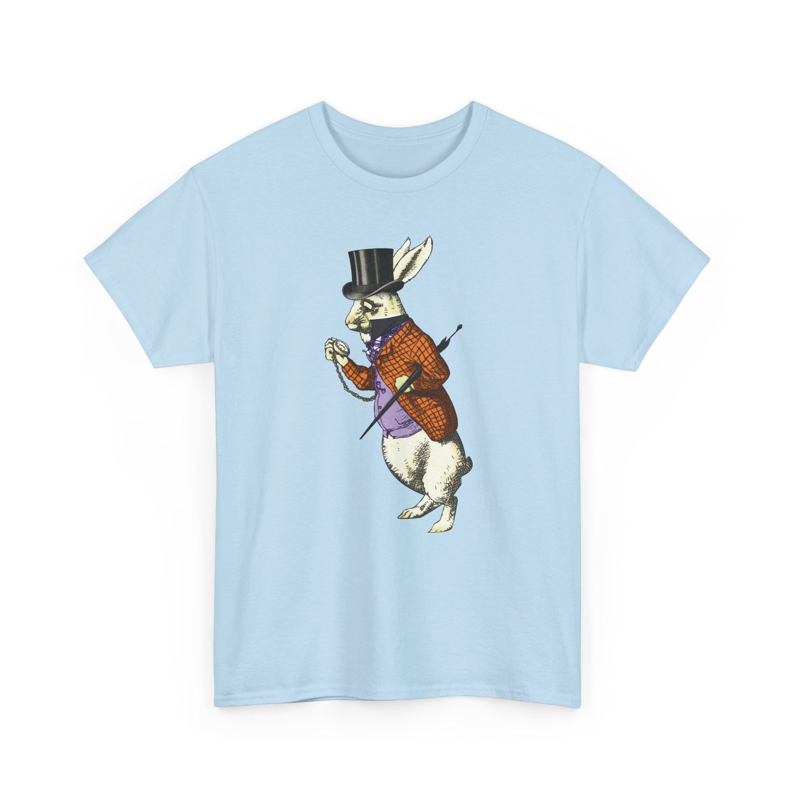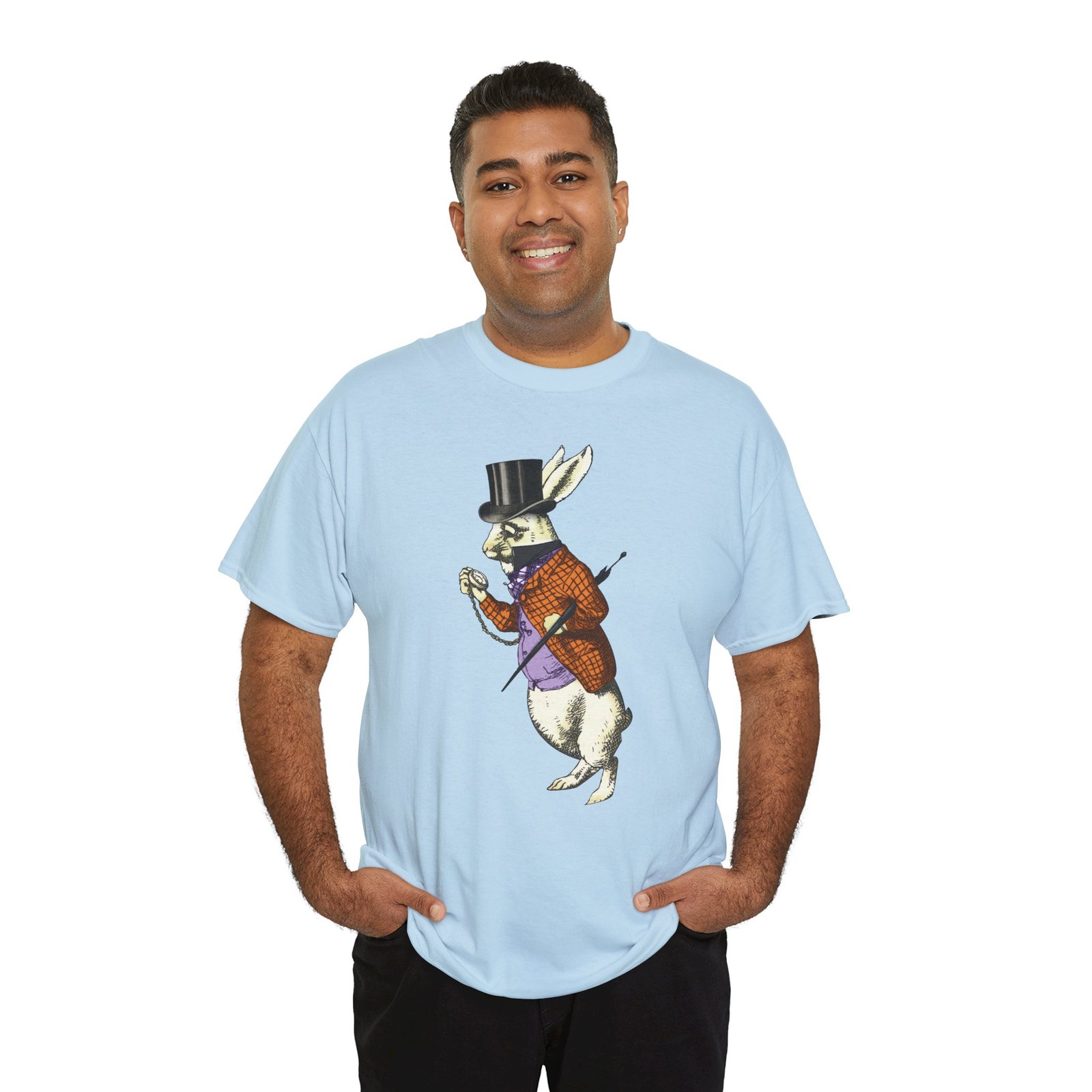 White Rabbit t-shirt, Alice in Wonderland shirt, pocket watch rabbit tee, Wonderland costume shirt, Halloween Alice tee, Lewis Carroll shirt, unisex heavy cotton tee, classic illustration shirt, book lover t-shirt, whimsical Wonderland shirt, fantasy storybook clothing, cosplay rabbit shirt, Wonderland fan gift, vintage Alice shirt, literary apparel, Halloween costume tee